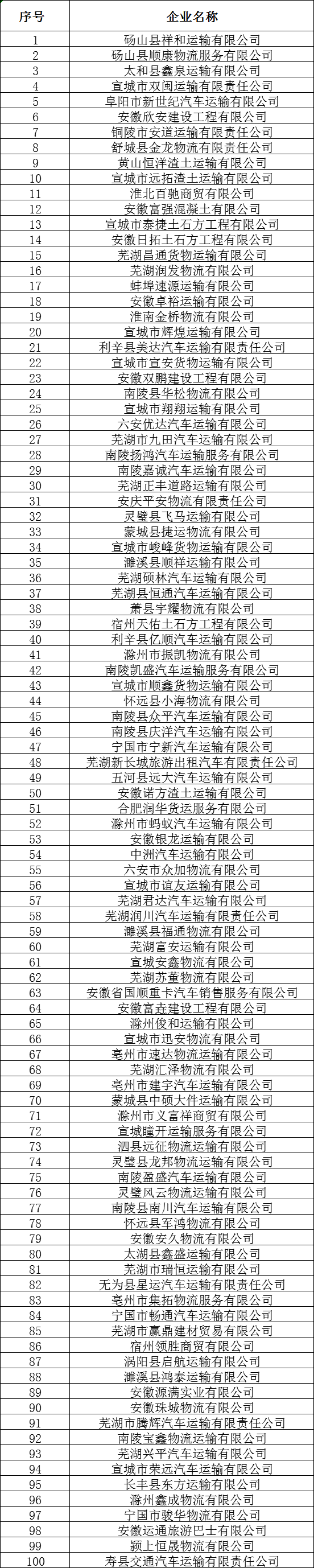 为扎实做好道路交通事故预防“减量控大”工作,安徽省公安厅交警总队根据公安部交通管理局关于机动车和驾驶人相关要求,确定了一批交通安全高风险运输企业,现对2023年12月份全省排名前100的交通安全高风险运输企业予以曝光,其中包括3家交通安全高风险危货运输企业。此外,有3家运输企业2023年连续多月被评为交通安全高风险运输企业,请相关企业负责人务必引起重视,整改到位。