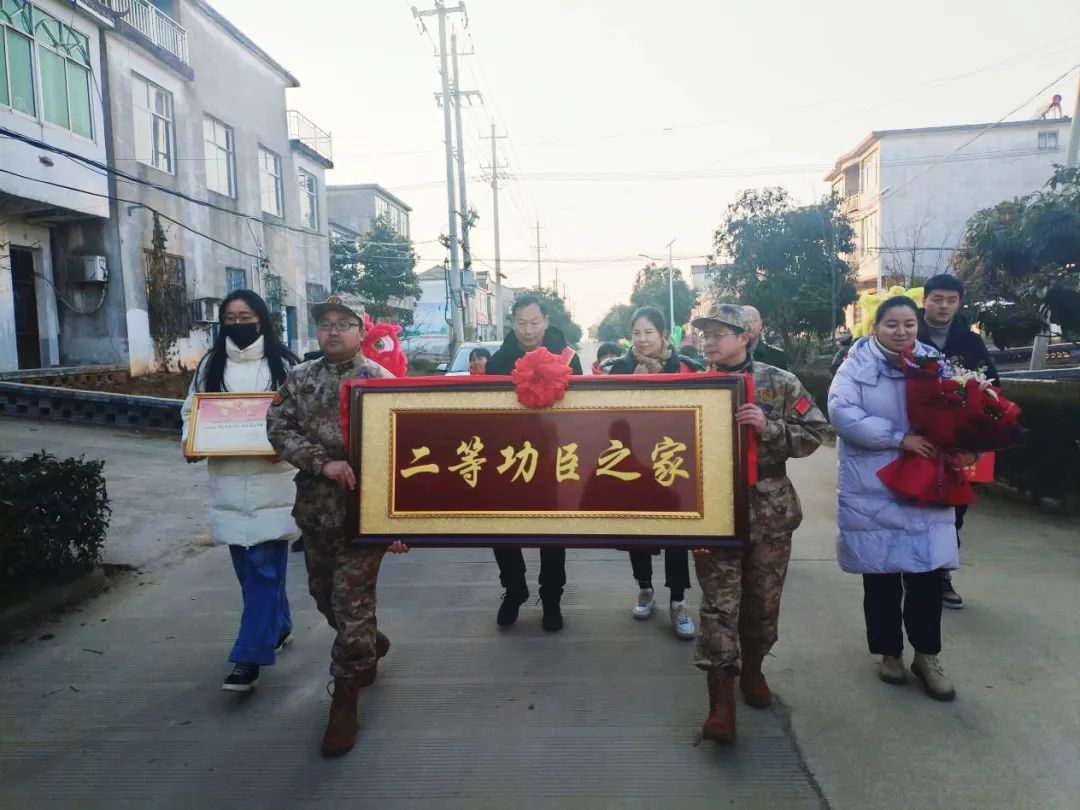 蚌埠发布客户端讯 1月25日,伴随着阵阵锣鼓声,在蚌埠市五河县,该县退役军人事务局、人武部和小圩镇人民政府联合将荣立二等功的立功喜报送到现役军人陈业挺家属手中,让家属同享喜悦荣光。