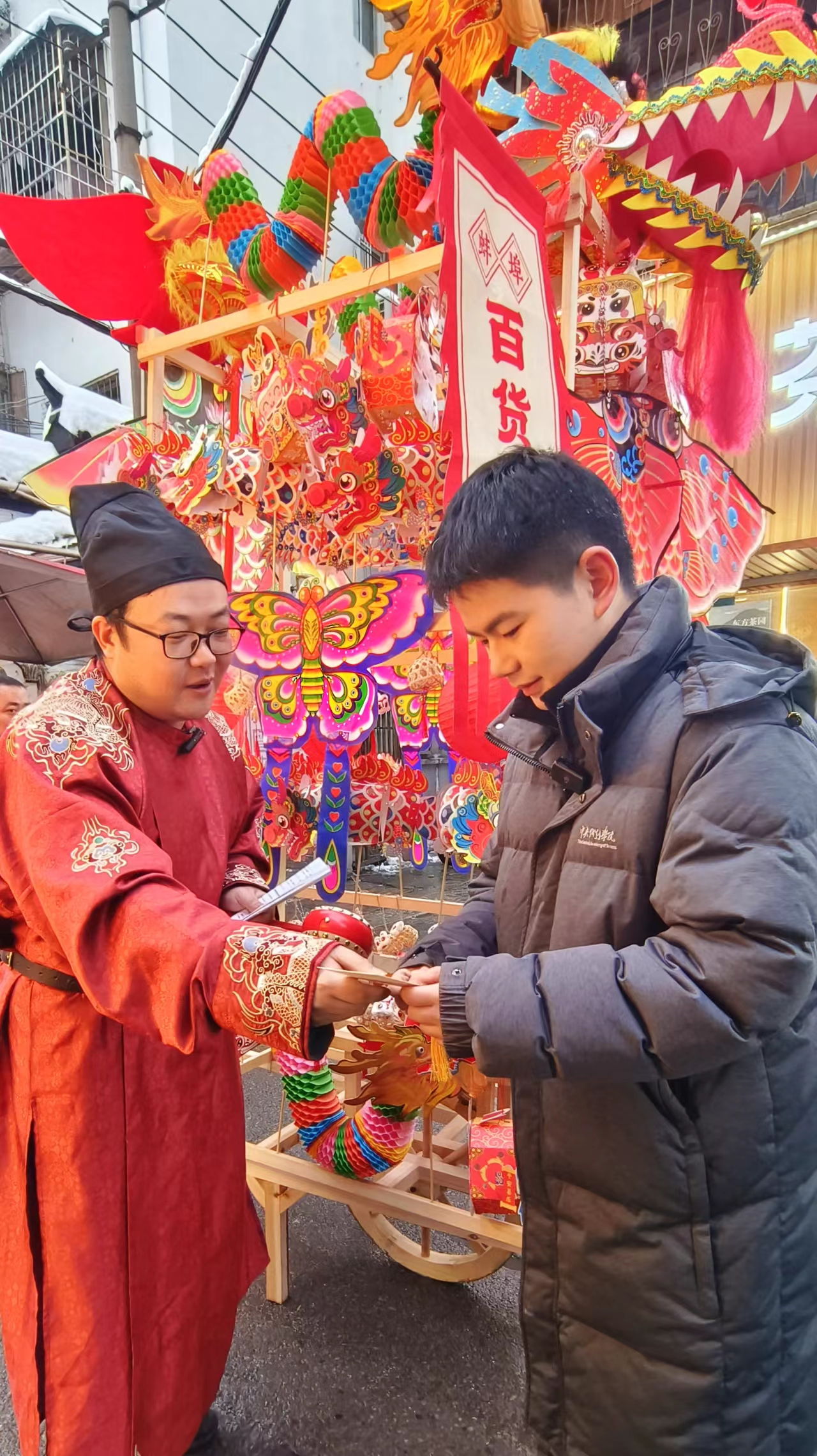 穿梭于人群中的古装卖货郎,一人一车一面拨浪鼓,叫卖声瞬间把人带回了旧时繁华;老街小巷的美食集市上,人们为了尝一口地道小吃而欣然等待;花灯摇曳、“珠翠满头”的龙灯车走街串巷,将满载的“星光”散入烟火人间;货郎车巡游、汉服巡演、舞龙舞狮、非遗技艺展演等新春活动,让游客们驻足拍照,乐此不疲……