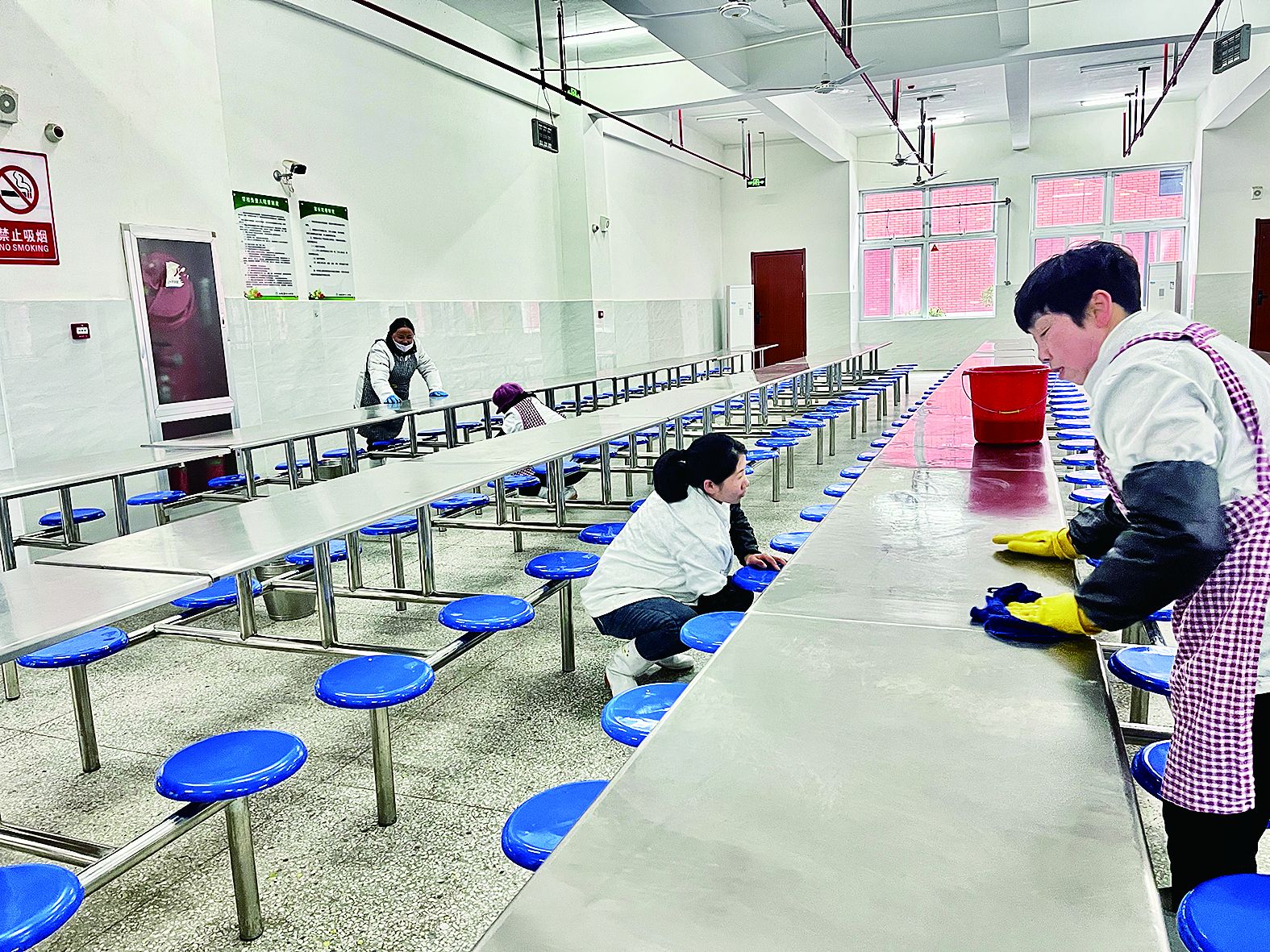 2月21日,蚌埠第十八中学开展了食堂环境卫生大扫除活动。食堂工作人员分工明确、协作有序,用热水清除过道地面的冰层,仔细清洗油烟管道、厨房机械,刷洗工作台,冲刷排污管道,用钢丝球或刷子清除卫生死角或顽固污渍……食堂里外都是工作人员忙碌的身影。“大半天的时间,食堂就焕然一新。该校总务处主任年富贵说,“新鲜食材采购工作也要抓紧安排起来。”当天,蚌埠第十八中学校长杨传飞带领学校行政班子人员分别对各班教室、食堂等,针对脱落的线盒、墙壁悬挂物、教学设备等方面进行全面排查。