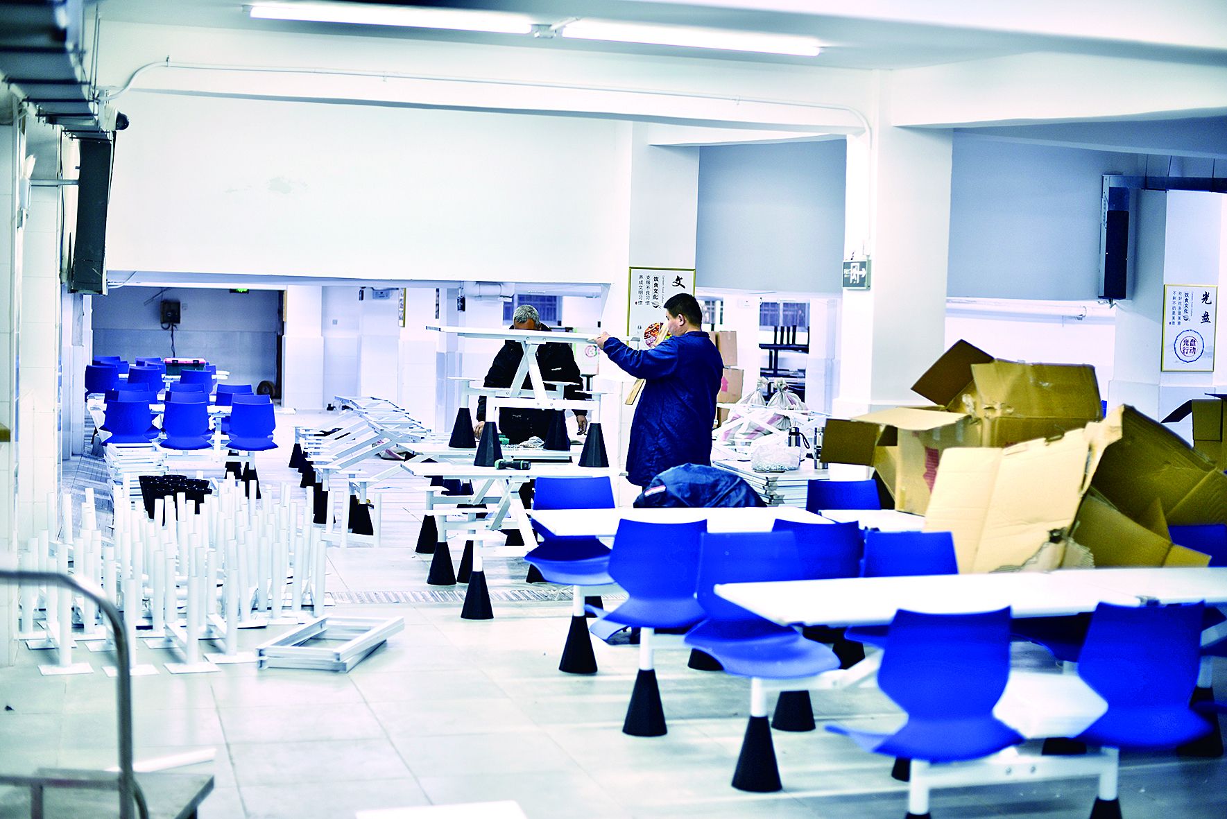 蚌埠田家炳中学食堂里,工作人员在安装新餐桌。
