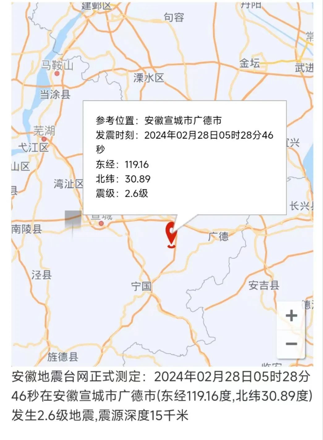 安徽地震台网正式测定,2024年2月28日5时28分,在安徽宣城广德市(北纬30.89度,东经119.16度)发生2.6级地震,震源深度15公里。据初步了解,广德市誓节镇、宣州区水东镇等部分地区有震感,无人员受伤和财产损失,群众生产生活秩序正常。