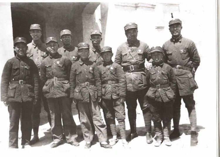 彭雪枫师长与参加拂晓剧团的开封孩子剧团团员合影,后排右起:彭雪枫、邴淳(国民党骑2军参议)、肖望东、岳夏、张震。前排右起:黄石文、杨世忠、关克涛、詹俊生、刘涛。