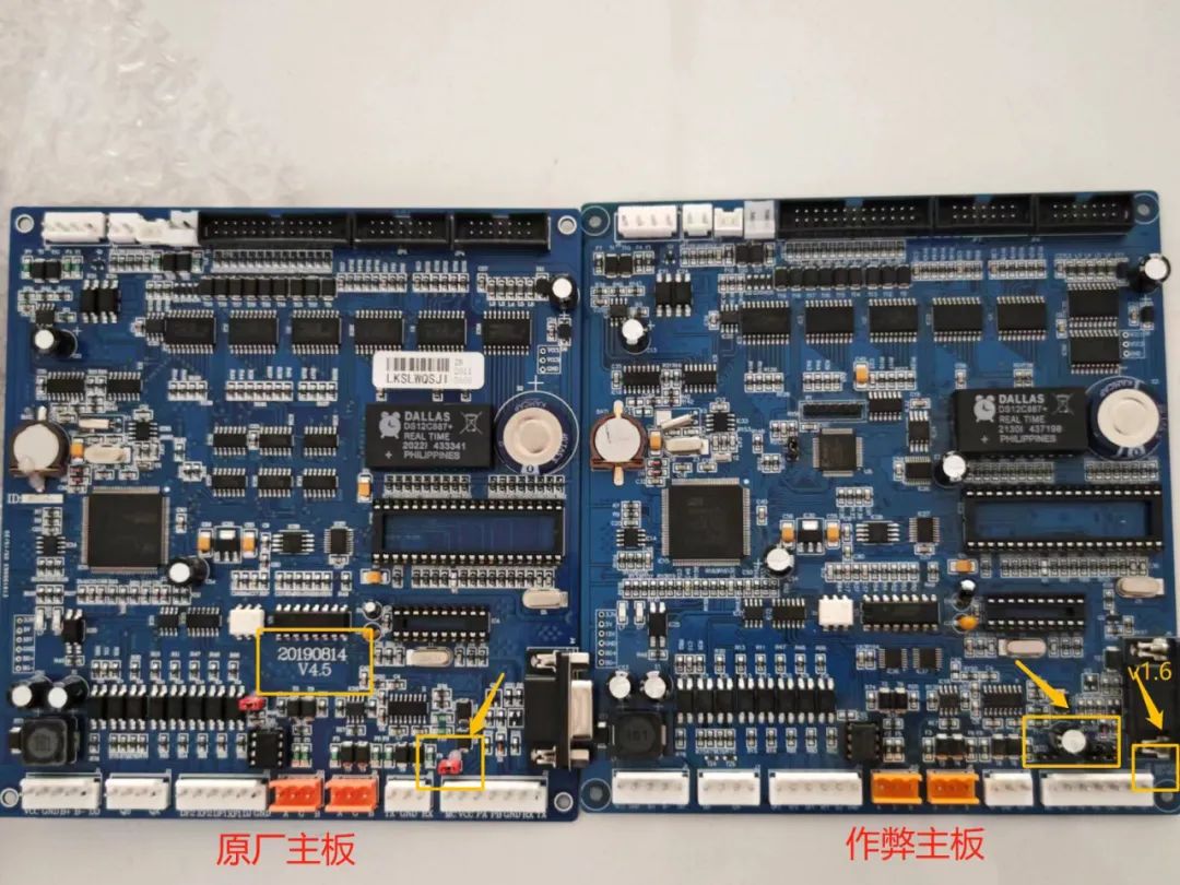 加油机原厂计控主板和非原厂主板对比图。(重庆市市场监管综合行政执法总队供图)