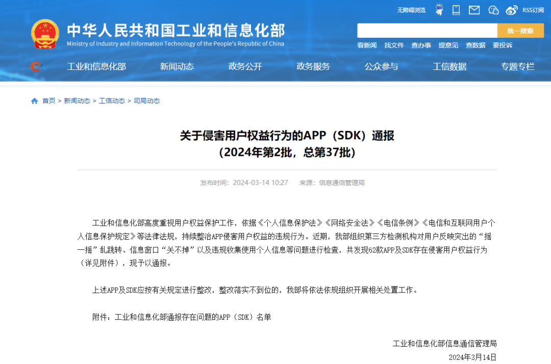 工业和信息化部高度重视用户权益保护工作,依据《个人信息保护法》《网络安全法》《电信条例》《电信和互联网用户个人信息保护规定》等法律法规,持续整治APP侵害用户权益的违规行为。近期,我部组织第三方检测机构对用户反映突出的“摇一摇”乱跳转、信息窗口“关不掉”以及违规收集使用个人信息等问题进行检查,共发现62款APP及SDK存在侵害用户权益行为(详见附件),现予以通报。