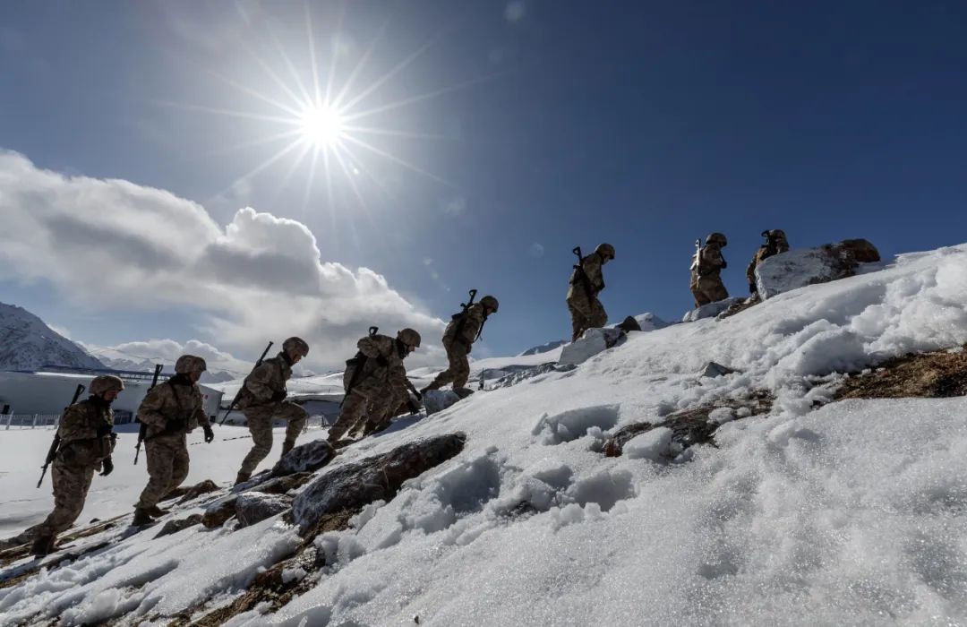 2023年4月13日,红其拉甫边防连的战士在巡逻。新华社记者 费茂华 摄