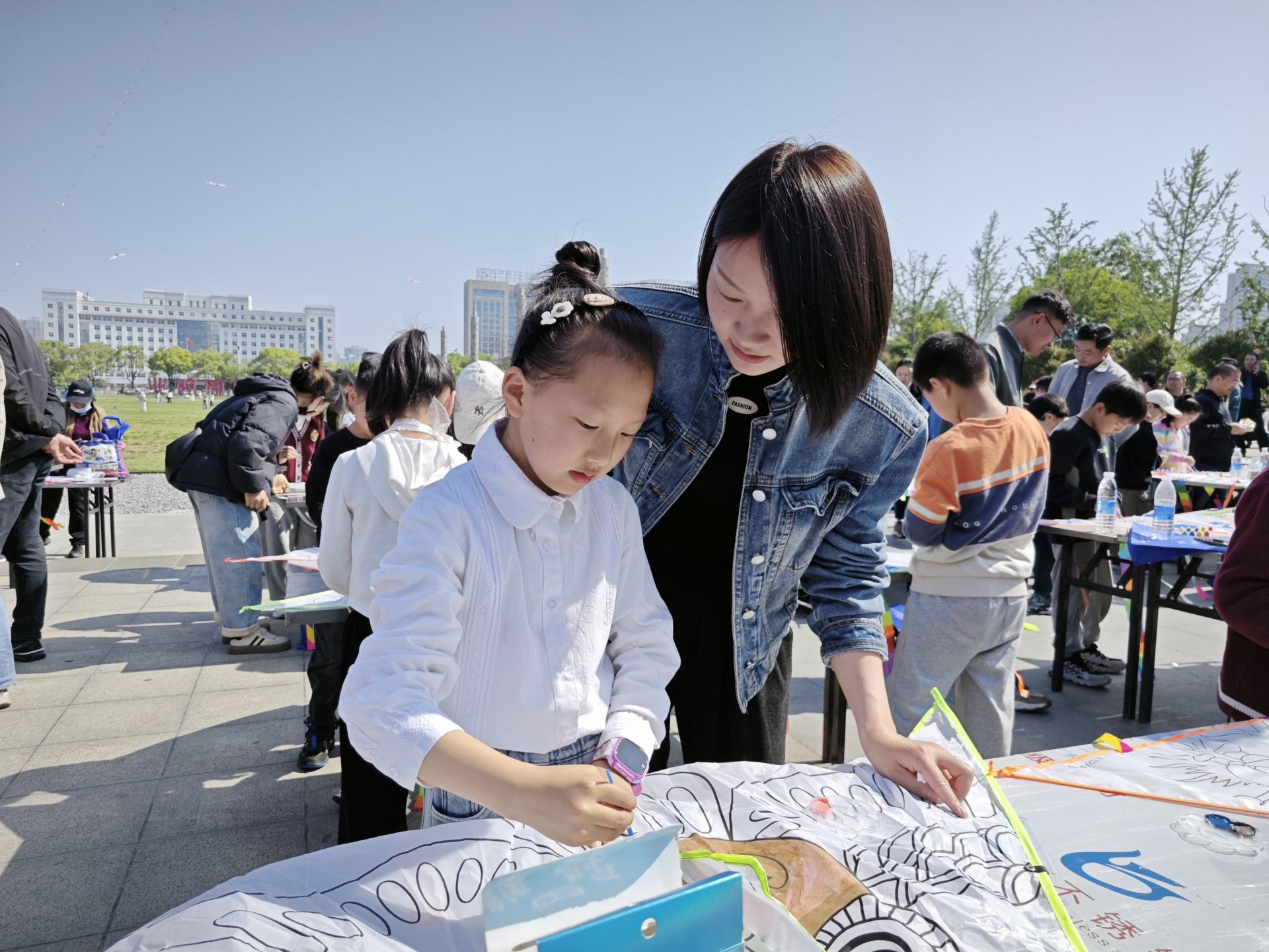 蚌埠新城滨湖学校三年级的学生张艺昕正和妈妈一起画风筝。“之前看到有这个活动,感觉挺有意思的,就报名带着孩子来参加了。”张艺昕妈妈告诉记者。小熊猫、蜻蜓、猫头鹰、小猪佩奇……小朋友们自己动手DIY的风筝造型多样,充满童趣。