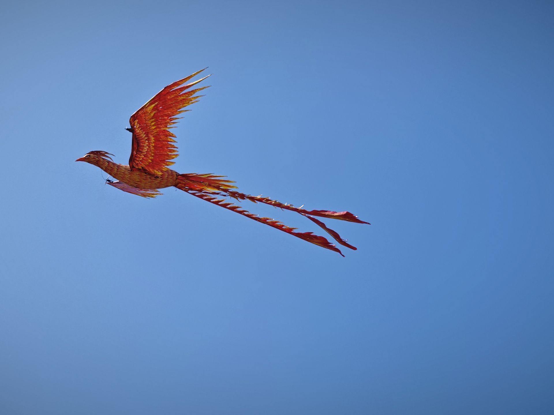 “快看飞机‘放屁’啦!”一架飞机航模直冲云霄,尾部模拟真实飞行状态释放出气体,吸引了人群的目光。飞机一落地,火凤凰接力在晴空里遨游。由马氏扎彩第四代非遗传承人马承刚带来的“火凤凰”一出场,便是全场焦点。
