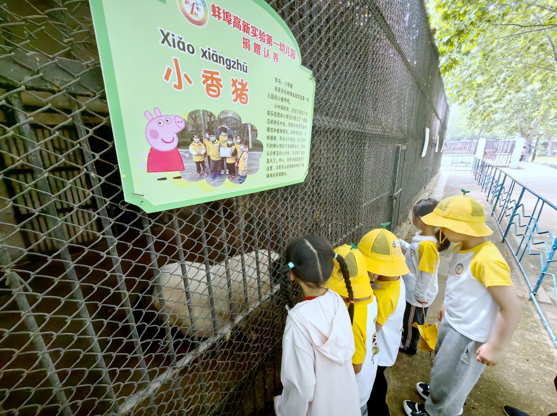 蚌埠高新实验第一幼儿园的园长汪玲回忆说,这只小香猪原名哼哼,是动物园四年前购买的。本意是让哼哼在幼儿园的萌宠乐园中生活,但哼哼在幼儿园饲养的半年间体重迅速增加,长得出乎意料的快。由于园区场地有限,原先为哼哼建造的小天地已经不能满足它的活动需求。经过多次考虑,幼儿园最终决定三年前将哼哼转交给张公山公园动物园,以便它能加入新的大家庭,与其他动物为伴,并得到经验丰富的管理员的精心照料。幼儿园每年都会组织孩子们前来探望哼哼,借此教育孩子们关于生命成长和关怀的重要课题。