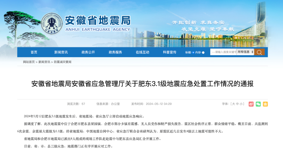 2024年5月12日肥东3.1级地震发生后,省地震局、省应急管理厅立即启动地震应急响应。据调度了解,此次地震震中位于合肥市肥东县梁园镇,合肥市部分乡镇有震感,无人员受伤和财产损失报告,震区社会秩序正常,群众情绪平稳。截至目前,共监测到6次余震,余震最大震级为1.1级。经省地震局、中国地震台网中心、省应急管理厅联合会商研判认为,原震区近几日发生4级以上地震可能性不大。省地震局和合肥市地震局已派出8人组成的现场工作队赶赴震中与肥东县应急局汇合开展工作。目前,省、市、县三级应急、地震部门正有序开展应对工作。
