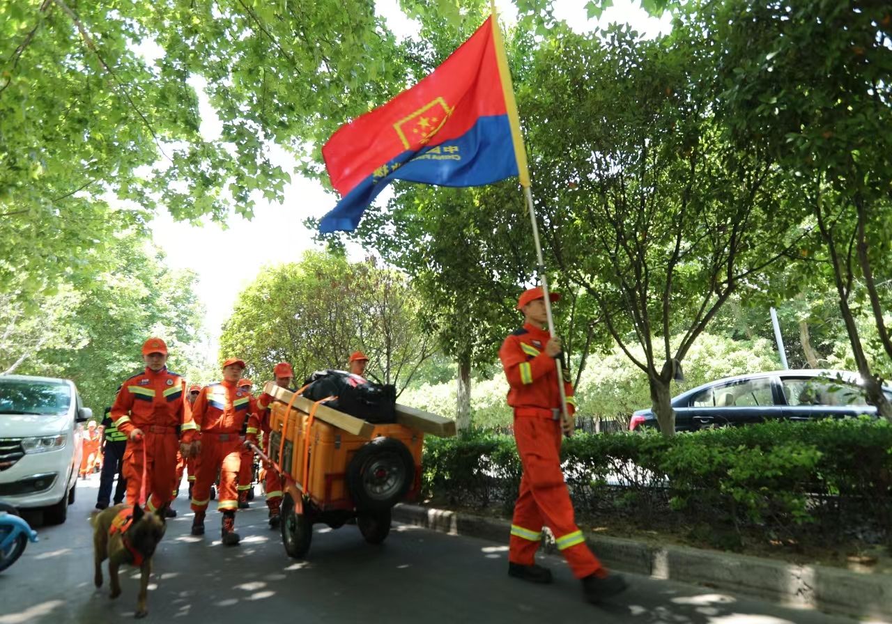 11:00,来自市消防救援支队轻型救援队、县区各大队消防队员等共60人,以及各类装备等全部集结完毕。因道路“塌陷”,车辆无法通过,救援人员全副武装,顶着33℃的骄阳,喊着整齐的口号,以坚定的毅力,徒步急行军10公里,最终全部赶到“地震”中心区域。两只救援犬也随队急行。抵达现场后,救援人员立即开展了通信联络、装备物资清点、宿营地搭建科目的演练。