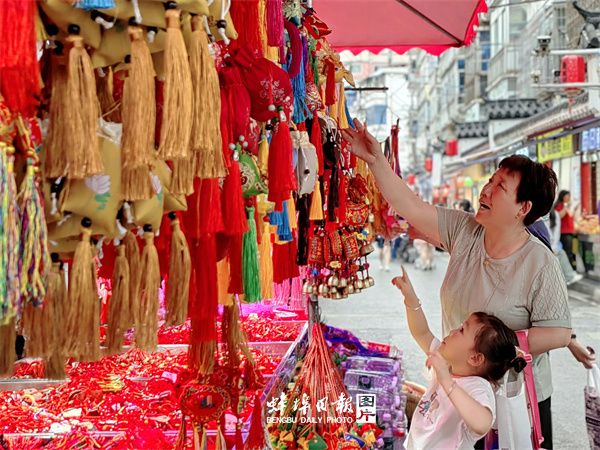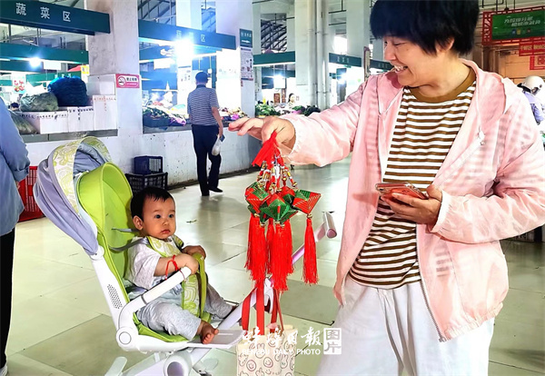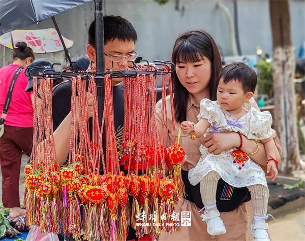 一对年轻的父母在为孩子挑选香囊 吴光辉 摄