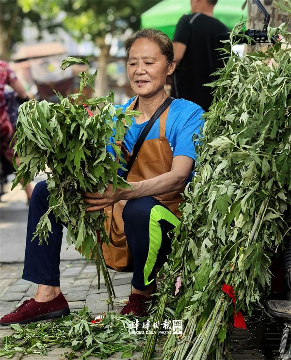 “清明插柳,端午插艾”,在门上倒挂艾草是端午节的传统习俗之一。今天一大早,一位市民在集贸市场,买了一把艾草,将那一抹艾香带回家中。夏炜 摄