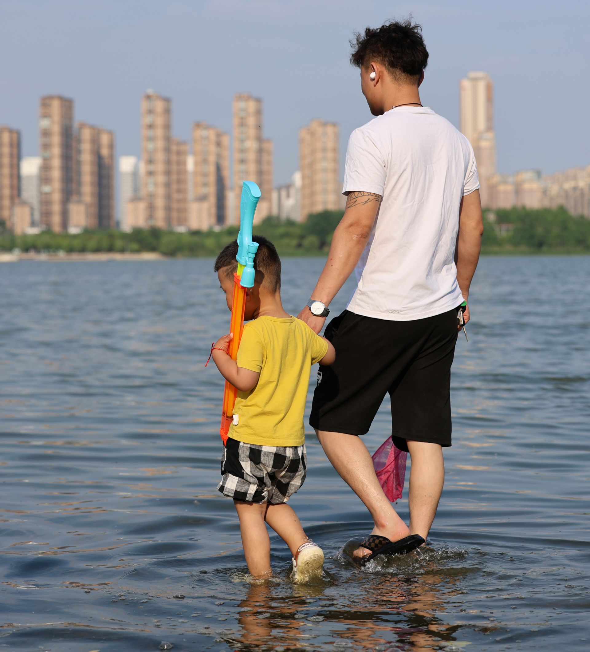 ▲2024年5月22日,蚌埠市龙湖公园,一位父亲带着孩子在涉水玩耍,陪伴孩子的成长 朱舒/摄
