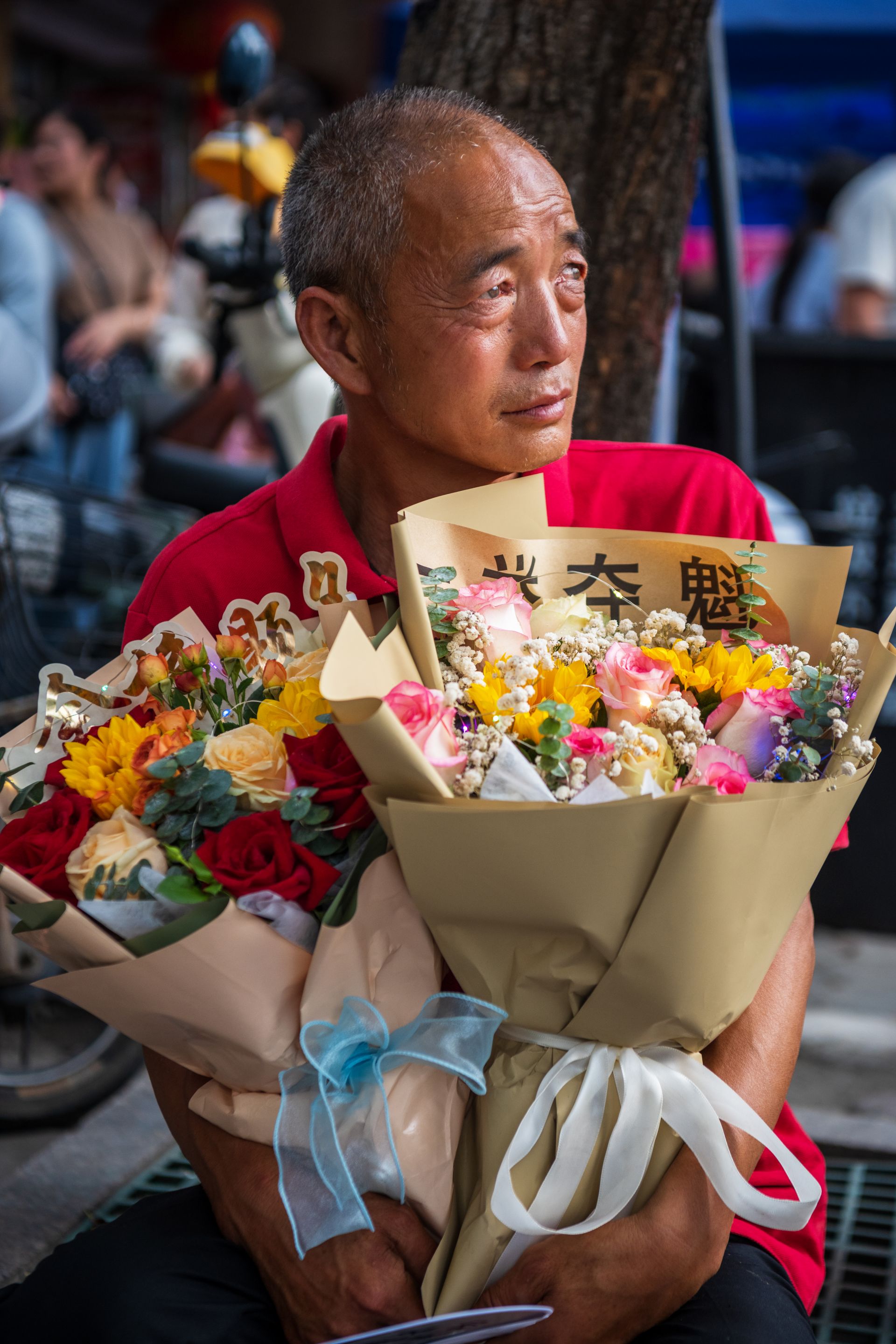 ▲《父亲的心愿》2024年6月9日五河县一中考点对面大树下一位父亲手捧鲜花在等待即将高考结束的女儿 董光跃/摄