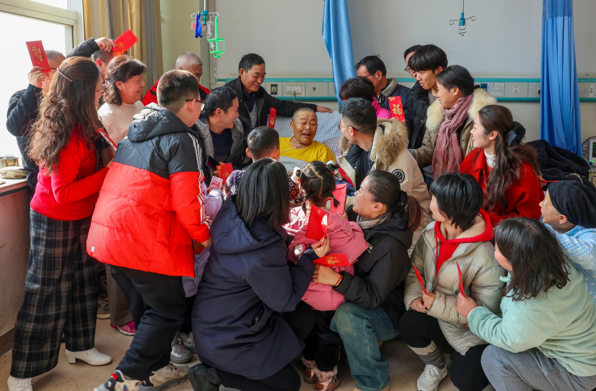▲2024年2月9日,农历年三十,蚌医一附院,子孙们在看望住院的老父亲,老人家高兴的为孩子们发红包 李青勇/摄