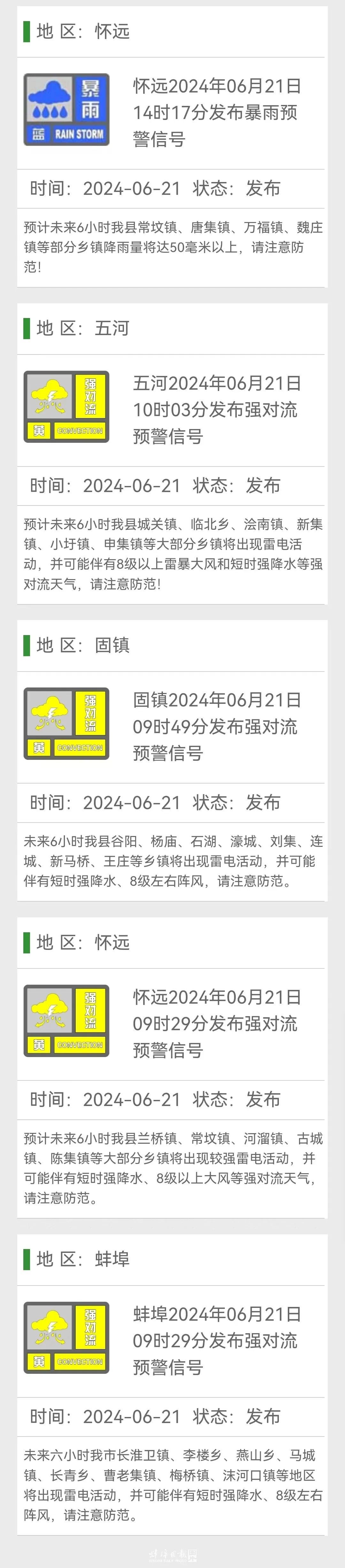 当天上午9:29分,蚌埠市气象台发布黄色强对流预警信号。上午10:00左右,我市由西向东开始出现明显降雨。截止到中午12:00,市区、怀远、固镇的绝大部分区域降雨量都达到了10mm以上,局地达到20mm以上。怀远南部、常坟镇一带雨量较大。