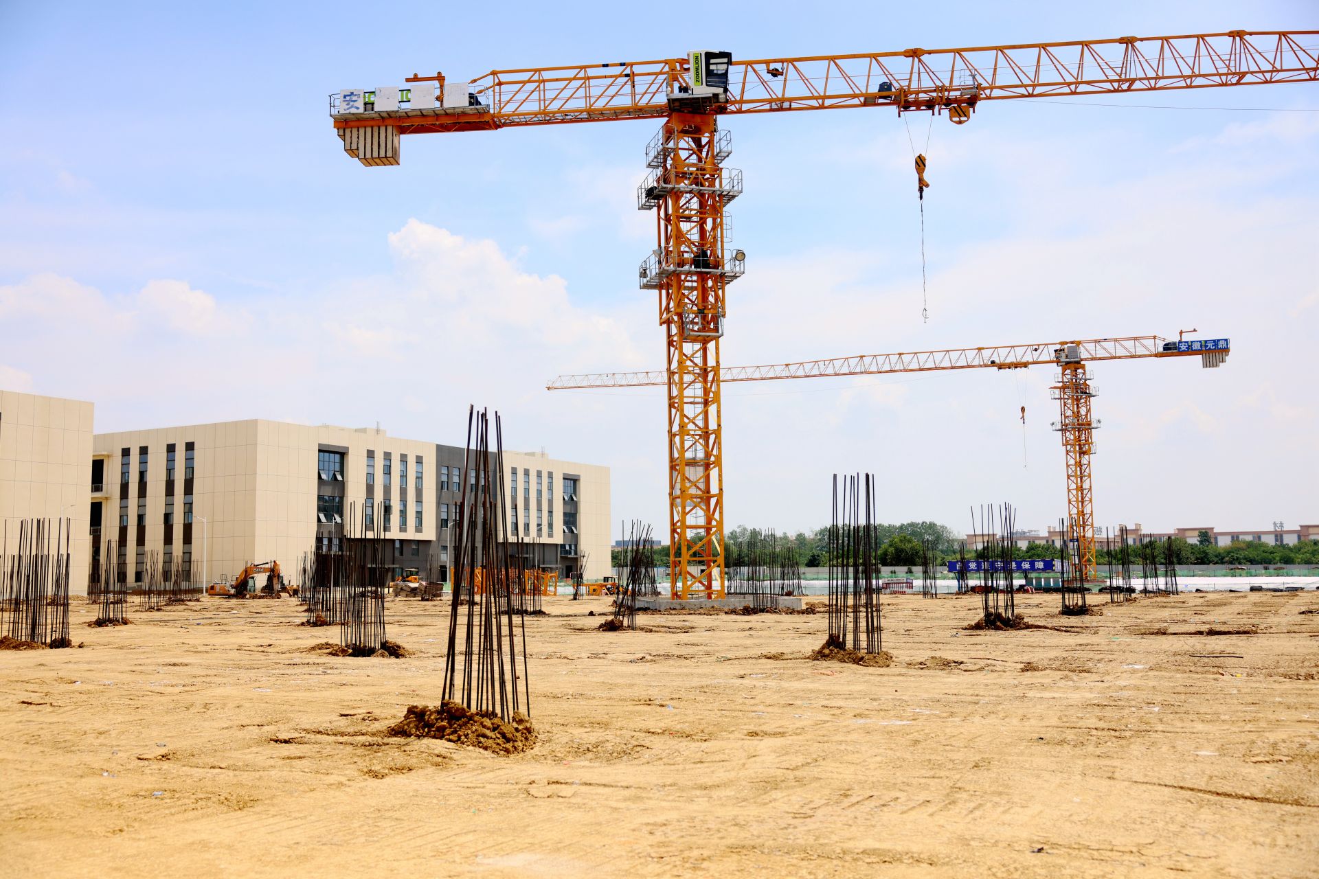6月23日,记者在安徽自贸试验区蚌埠片区加工贸易产业聚集区配套基础设施一期项目启动区工程现场看到其建设效果显现,各岗位正抓紧有利天气冲刺节点。该工程位于蚌埠高新区内,东至中科路,西至义和路,南至Q-35,北至仁和路,总用地面积约23万㎡,总投资约13.2亿元,其中一期项目建设内容包括仓储加工区和配套道路。据介绍,目前仓储加工区9号钢结构厂房正在进行地坪施工,本月底仓储加工区9栋厂房全部建设完工,同时1号和2号仓库正同步开展基础施工。(融媒体记者 刘晨 摄)