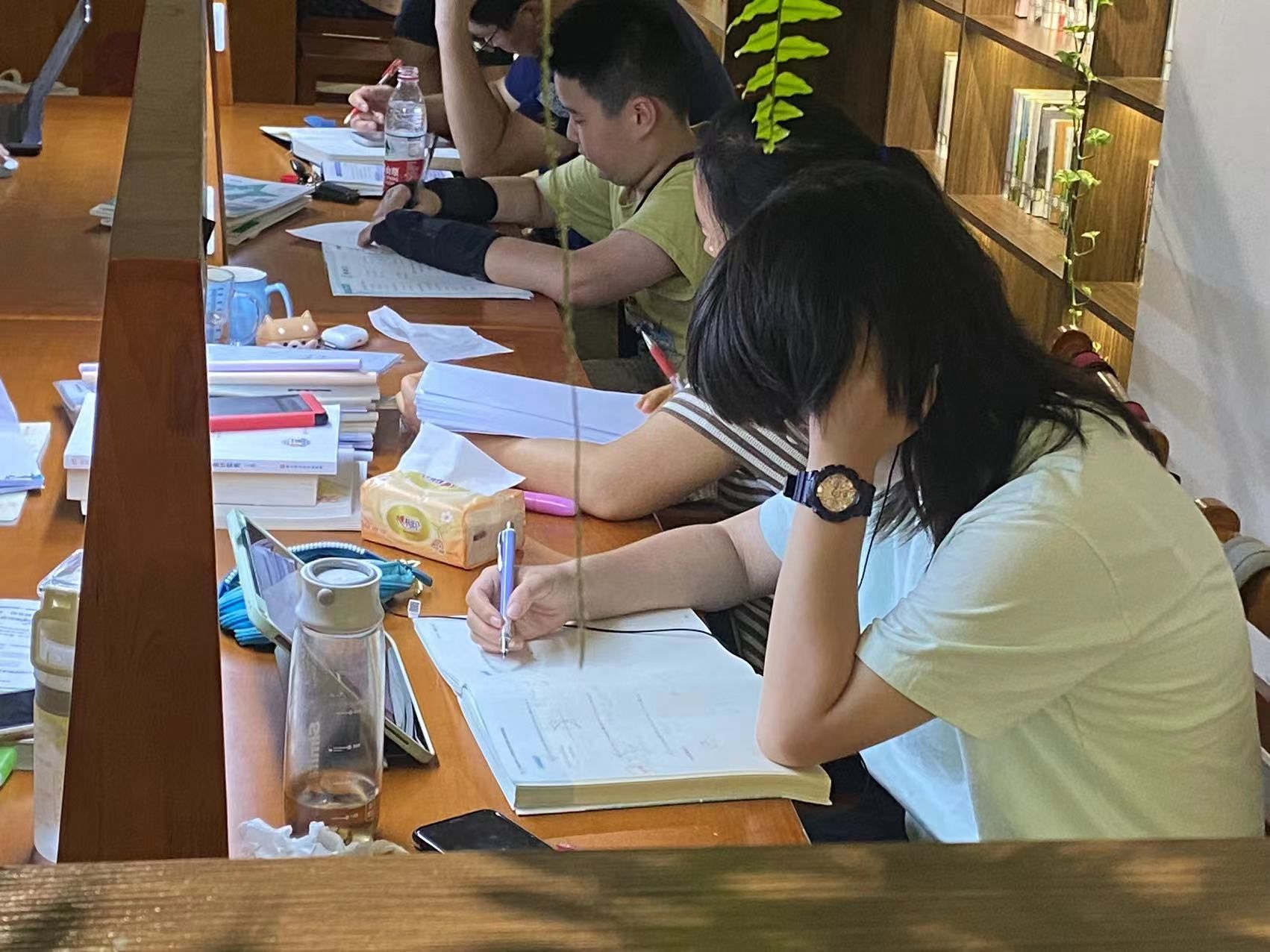 17岁的张启超,在杭州一家私立学校读书,暑假回到蚌埠。除了每天去辅导班、吃饭、睡觉、运动,他的大部分暑假时间都在这个启书房里度过。张启超说,自己每天下课后就会来这里,经常是回家吃了晚饭继续过来,一直到晚上10点半才回去,因为“这里的学习氛围比家里好多了,更容易沉浸其中”。