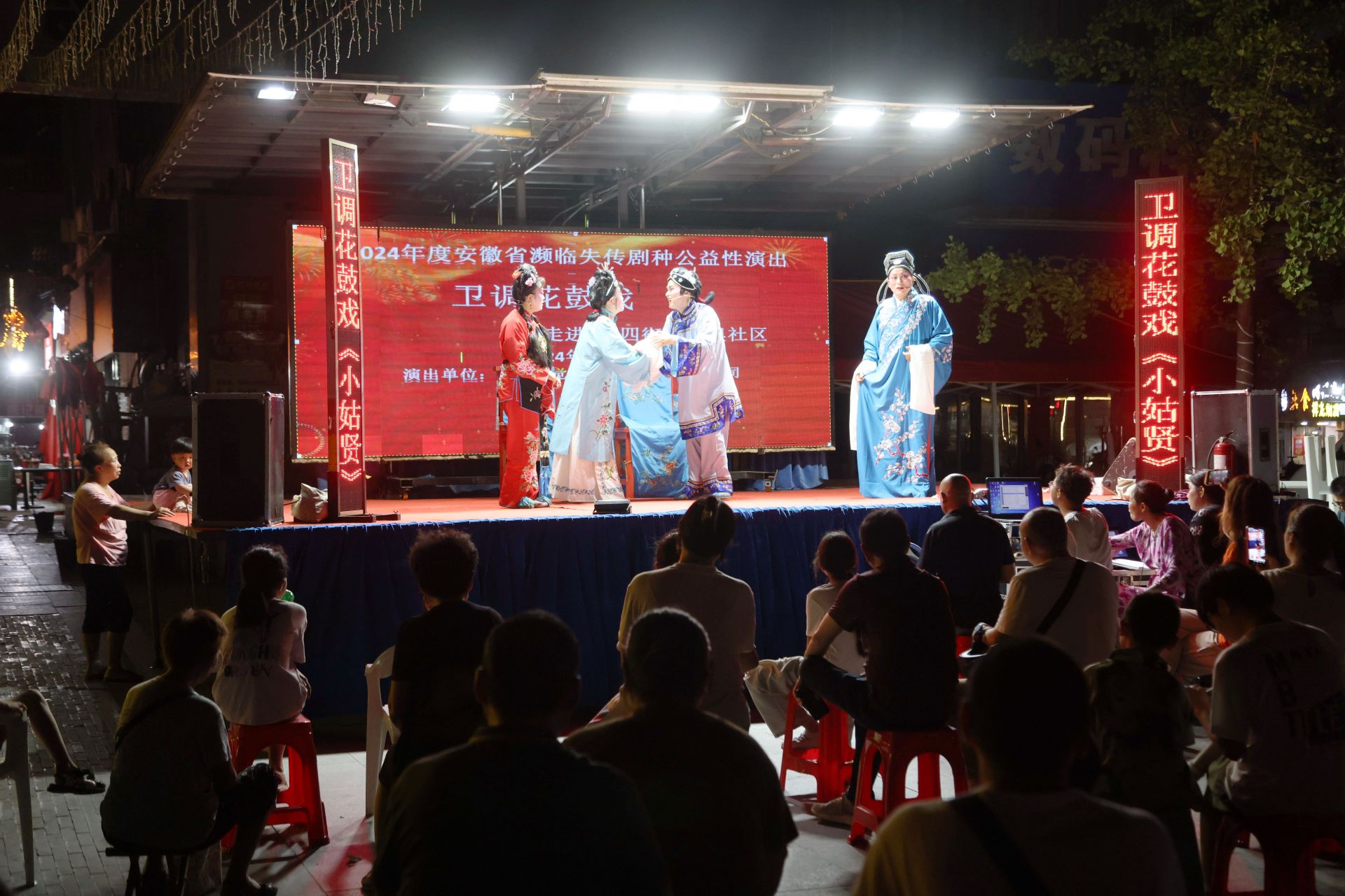 蚌埠发布客户端讯 7月8日晚,2024年安徽省濒临失传剧种公益性演出卫调花鼓戏展演在蚌埠市禹会区纬四街道和广大市民见面,本次演出由蚌埠医科大学卫调花鼓戏传习基地的师生们共同完成,首场演出剧目为传统卫调花鼓戏《小姑贤》。