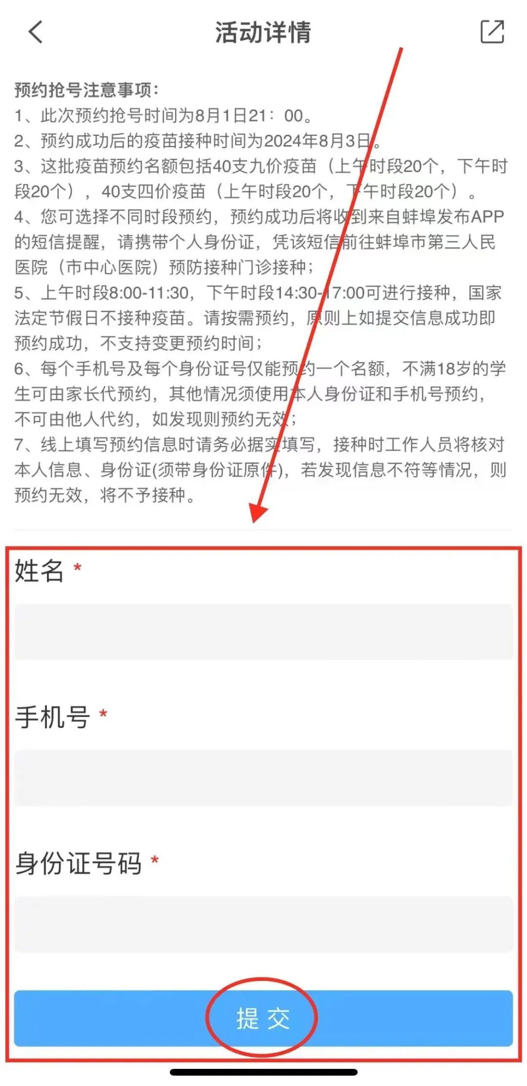 3、您可选择不同时段预约,预约成功后将收到来自蚌埠发布APP的短信提醒,请携带个人身份证,凭该短信前往蚌埠市第三人民医院(市中心医院)预防接种门诊接种;