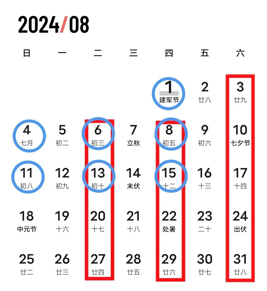 8月1日、8月4日、8月6日、8月8日、8月11日、