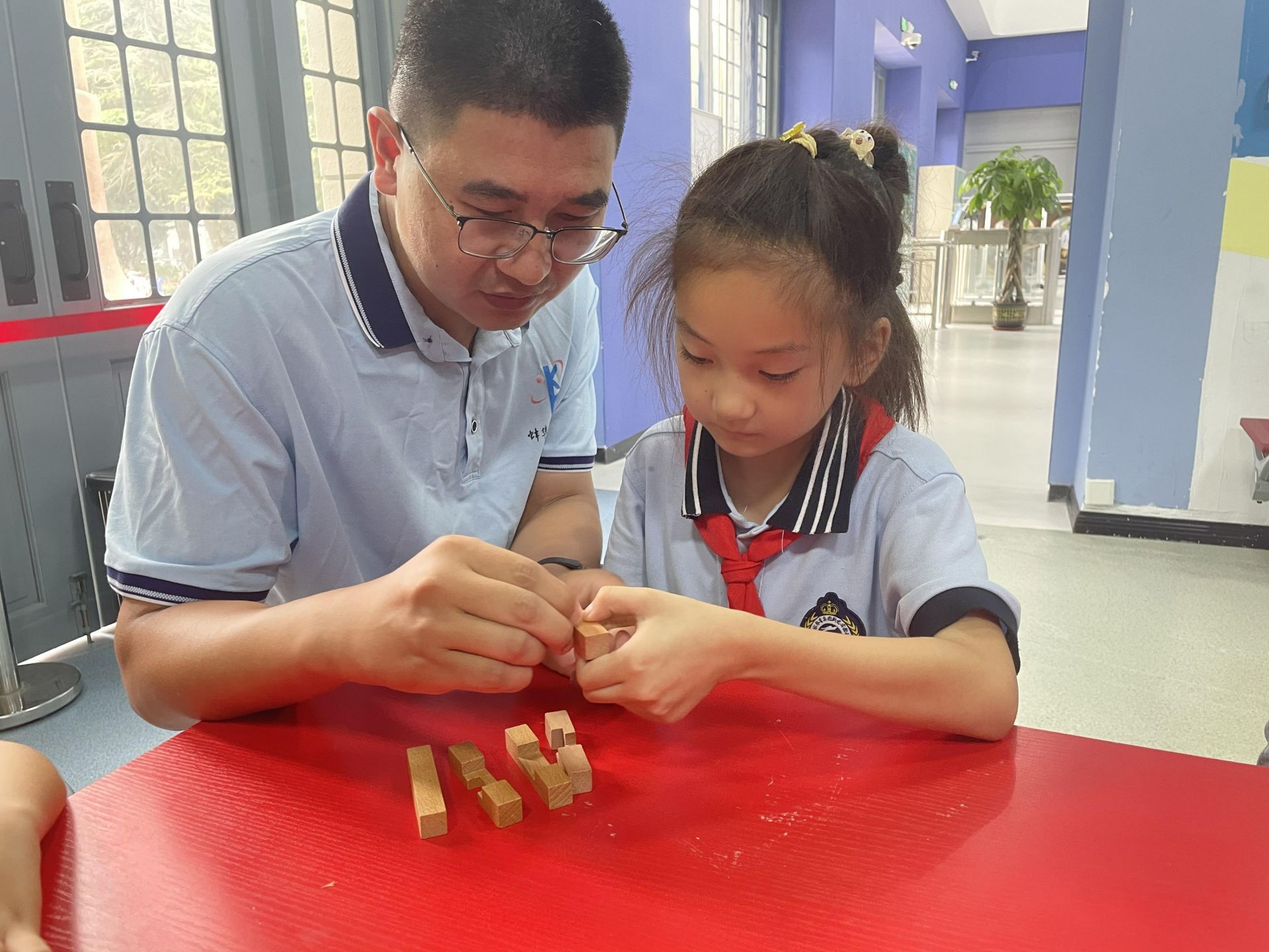 大家拿到榫卯木块后都跃跃欲试,纷纷化身“能工巧匠”,根据老师讲解的榫卯结构、特点及操作步骤仔细认真地搭建自己的作品,体会着榫卯的魅力与奥妙。搭建过程中,队员们你一言我一语,互相交流,互相合作,有效沟通和协调,以确保搭建作品的稳定性。在整个过程中,队员们不仅锻炼了动手能力,更在潜移默化中培养了空间想象能力、逻辑推理能力和创新思维,还通过对传统工艺的实践体验,对中华优秀传统文化有了更深入的认识和感知。