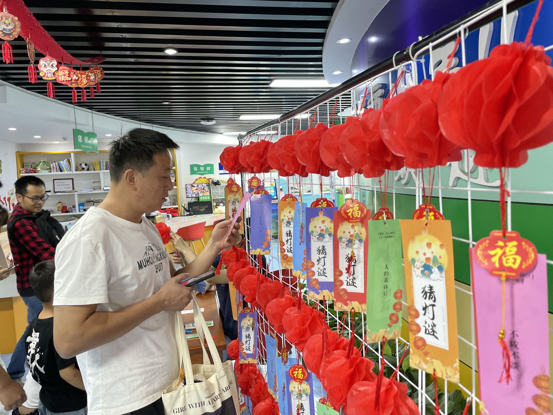 中秋节猜灯谜是一项传统的节日活动。妙趣横生的谜面涵盖了中秋节传统文化知识及各种生活常识,馆员老师更为广大读者准备了各色艾草香囊作为答题礼品。活动现场气氛热烈,读者们三五成群,或交头接耳互相讨论,或独自沉思探寻谜底。随着谜底被一一解开,读者们既了解到传统文化知识,丰富了精神文化生活,更感受到欢乐喜庆的浓浓节日气氛。