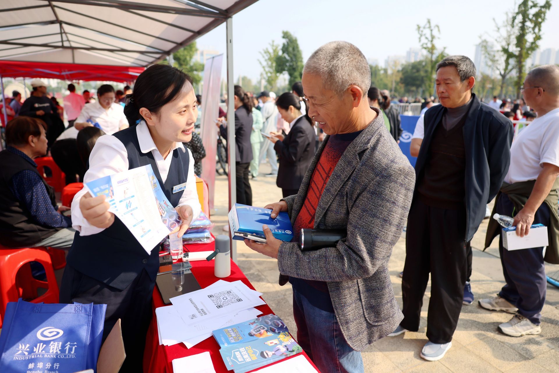 舞台外,兴业银行蚌埠分行的工作人员的也来到现场,积极参与本次活动。不少老年朋友围绕在展位前,饶有兴致的咨询“安愉人生”及兴业银行的其他金融产品。