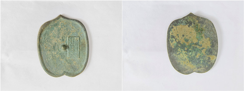 该铜镜锈蚀严重,直径约10厘米,厚约0.2厘米。镜面微凸,呈鸡心形,内区拱形钮,外区素平,镜体稍厚,镜钮左侧有铭文:“湖州真石家念(廿)二叔照子”。(内、外区,指纹饰分布的区域,是为研究铜镜的纹饰而划分;靠近纽的部分为内区,靠近边缘的为外区。素平,泛指将材料表面凿平,没有图案题材的雕刻形式。)