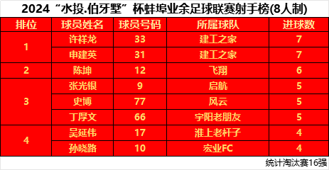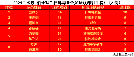 来看争夺激烈的射手榜。社会组(11人制)中,蚌埠德豪金的54号球员刘耀东,在上周末的比赛中再下一城,以10粒进球继续保持射手榜第一位。而蚌埠老男孩的18号球员李家豪以9粒进球紧追不舍。爱心的31号球员潘博文以8粒进球紧随其后。社会组(8人制)中,建工之家的33号球员许祥龙、31号球员申建英均以7粒进球并列第一,飞翔的12号球员陈坤以6粒进球位列第二。