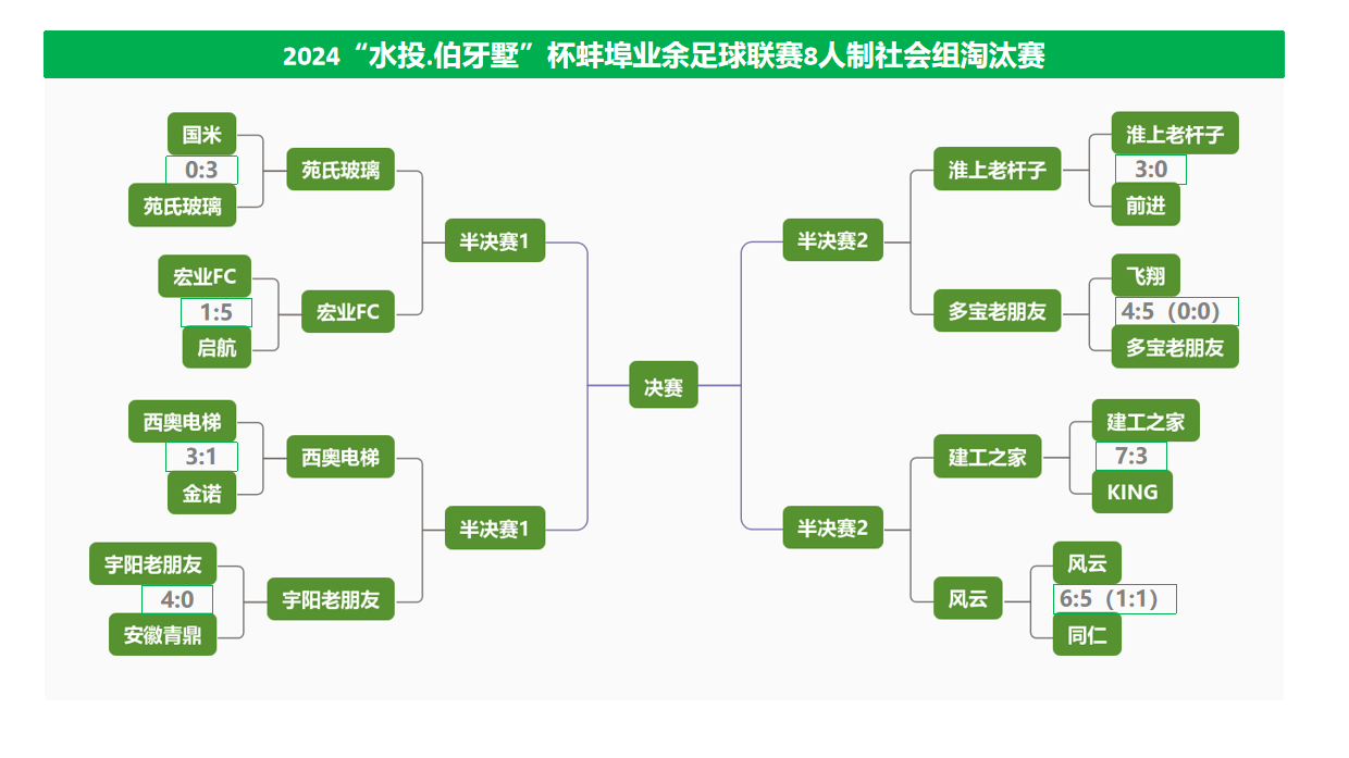 淘汰赛方面,上周末,社会组(8人制)组别中,16支小组赛出线球队捉对厮杀,争夺8强名额。上半区,国米0:3不敌苑氏玻璃,淘汰宏业FC5:1淘汰启航,西奥电梯3:1战胜金诺,宇阳老朋友4:0战胜安徽青鼎。下半区,淮上老杆子3:0淘汰前进,飞翔4:5不敌多宝老朋友,建工之家7:3战胜KING,风云6:5险胜同仁。至此,社会组(8人制)8强全部产生。淘汰赛中,也有三名球员“戴帽”。
