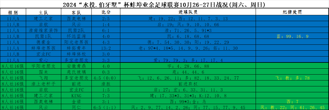 在社会组(11人制)A组,西奥电梯5:2战胜建工之家,淮南维家装饰6:1大胜凯茵2队,榜首的德豪金4:3小胜阳光老男孩。蚌埠老男孩13:2大胜蚌拓青年,创造本届联赛最大比分,上演了进球大战,蚌埠老男孩97号球员有4粒进球入账,18号球员更是打进5球。爱心3:3与多宝老朋友握手言和。B组中,风云4:1战胜启航,凯茵1队4:0怀远蓝湾,宏业FC3:0与战胜蚌埠体校。
