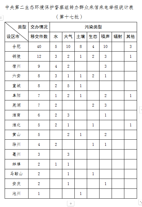 截至11月6日9时,我省收到中央第二生态环境保护督察组转办的第十七批群众信访举报件121件,涉及环境问题121个。其中,大气环境问题34个、水环境问题27个、噪声问题27个、土壤问题14个、生态问题13个、其他污染问题6个。第十七批转办信访件涉及16个地市,分别是:合肥市(40件)、铜陵市(12件)、宿州市(9件)、六安市(8件)、宣城市(8件)、阜阳市(7件)、芜湖市(7件)、淮南市(6件)、淮北市(5件)、黄山市(5件)、滁州市(4件)、亳州市(3件)、蚌埠市(2件)、马鞍山市(2件)、安庆市(2件)、池州市(1件)。
