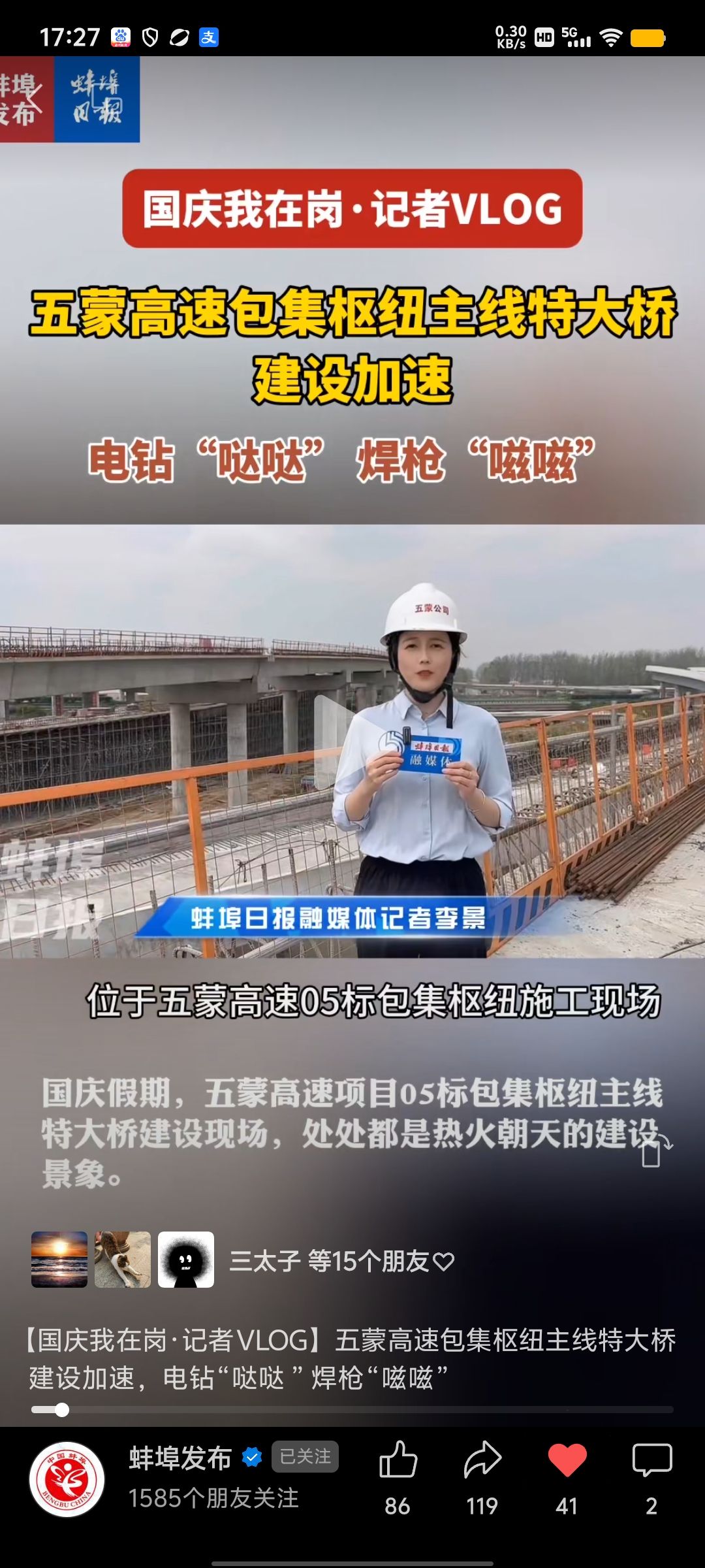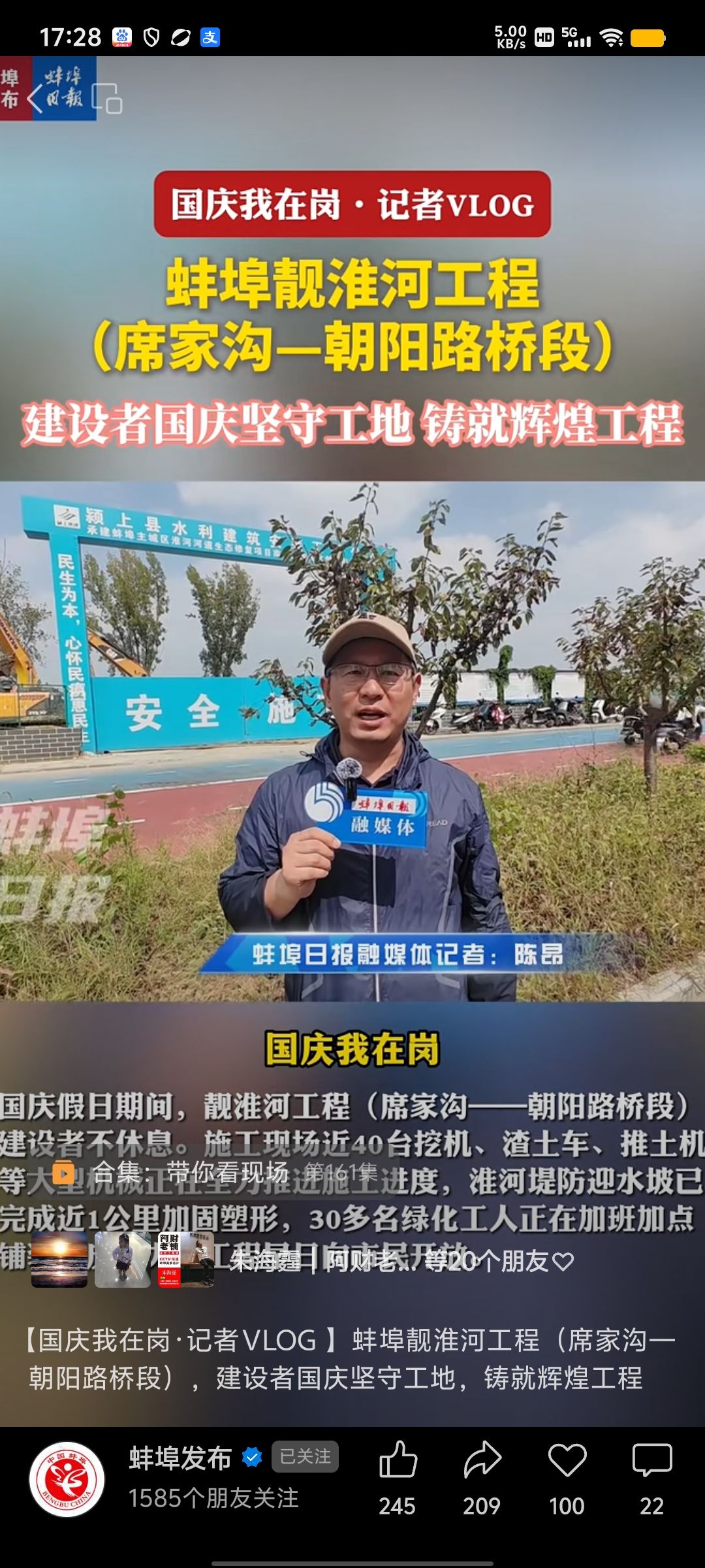 “假期不休息,节日我在岗。今天,蚌埠日报融媒体记者带您来到靓淮河西段施工现场……”