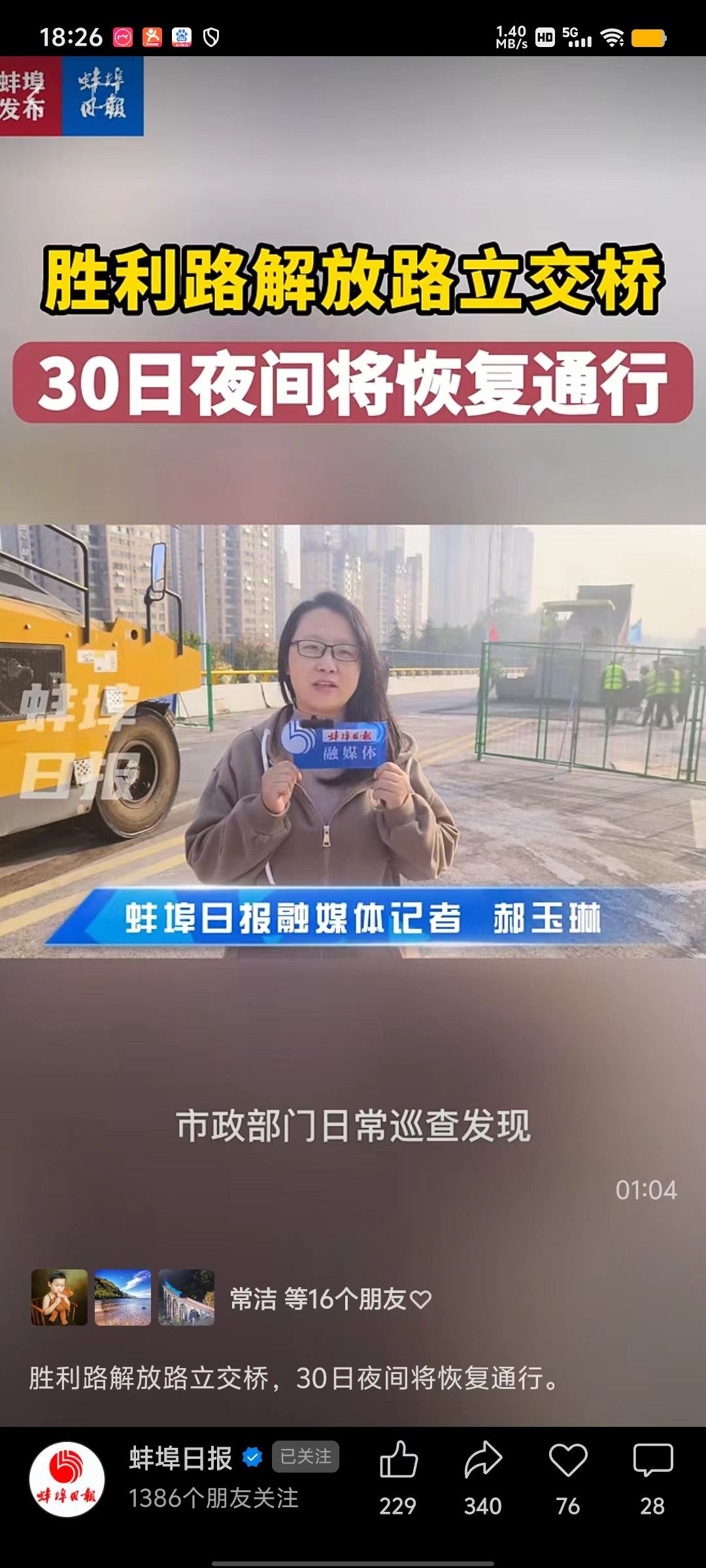胜利路解放路立交桥10月30日夜间恢复通行,在获知信息的第一时间,记者郝玉琳就带上装备赶到现场。为了争分夺秒抢发新闻,她没有妆造、不开美颜,以最真实、最松弛的形象面对镜头,播报新闻的现场情况、最新进展。