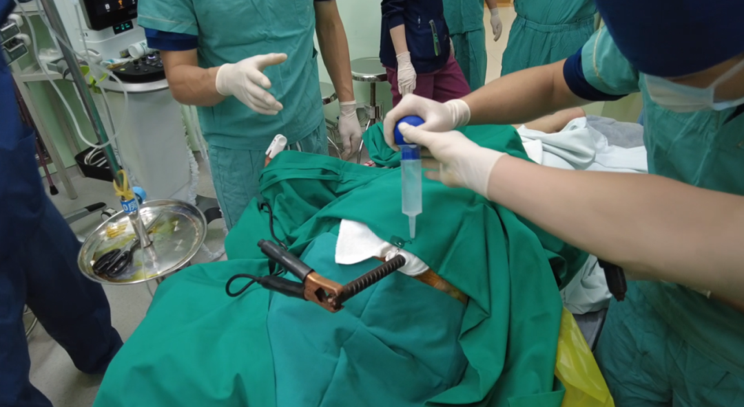 刺破肠道、肝脏、膈肌、右肺、肋骨
