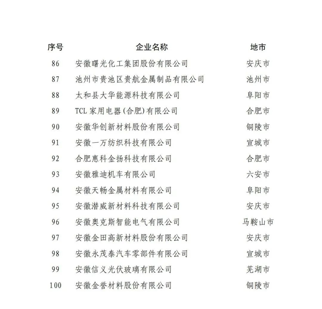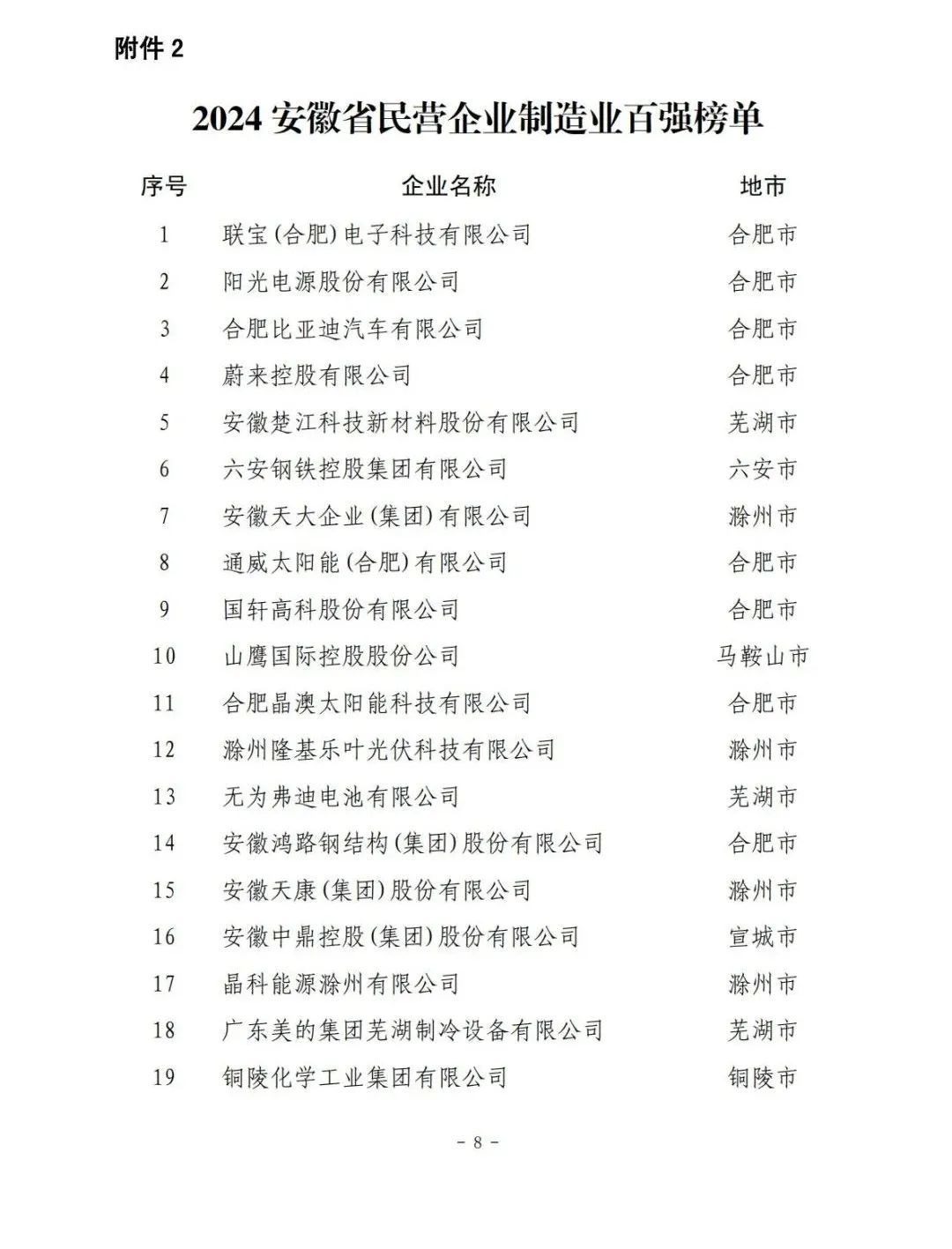 联宝(合肥)电子科技有限公司、阳光电源股份有限公司、合肥比亚迪汽车有限公司、蔚来控股有限公司、安徽楚江科技新材料股份有限公司位列安徽民营企业营收百强前五。