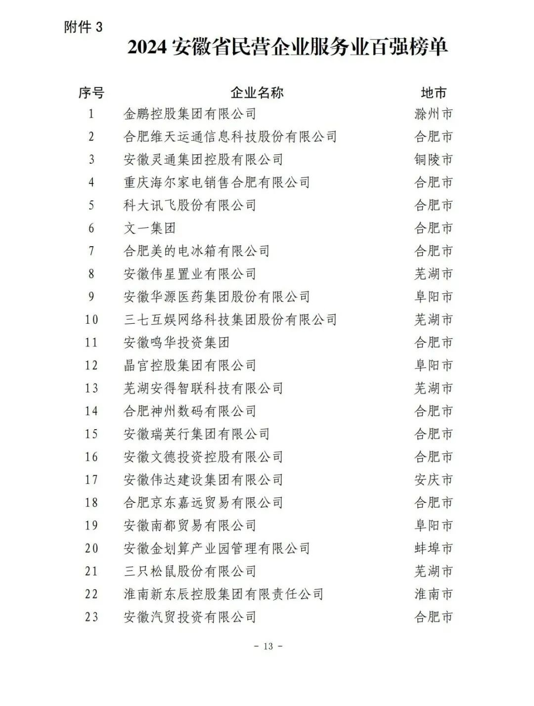 11月29日上午,2024安徽省民营企业百强发布会在合肥举行。安徽省工商联、安徽省工信厅、安徽省市场监管局公布2024安徽省民营企业营收百强、制造业百强和服务业百强榜单。