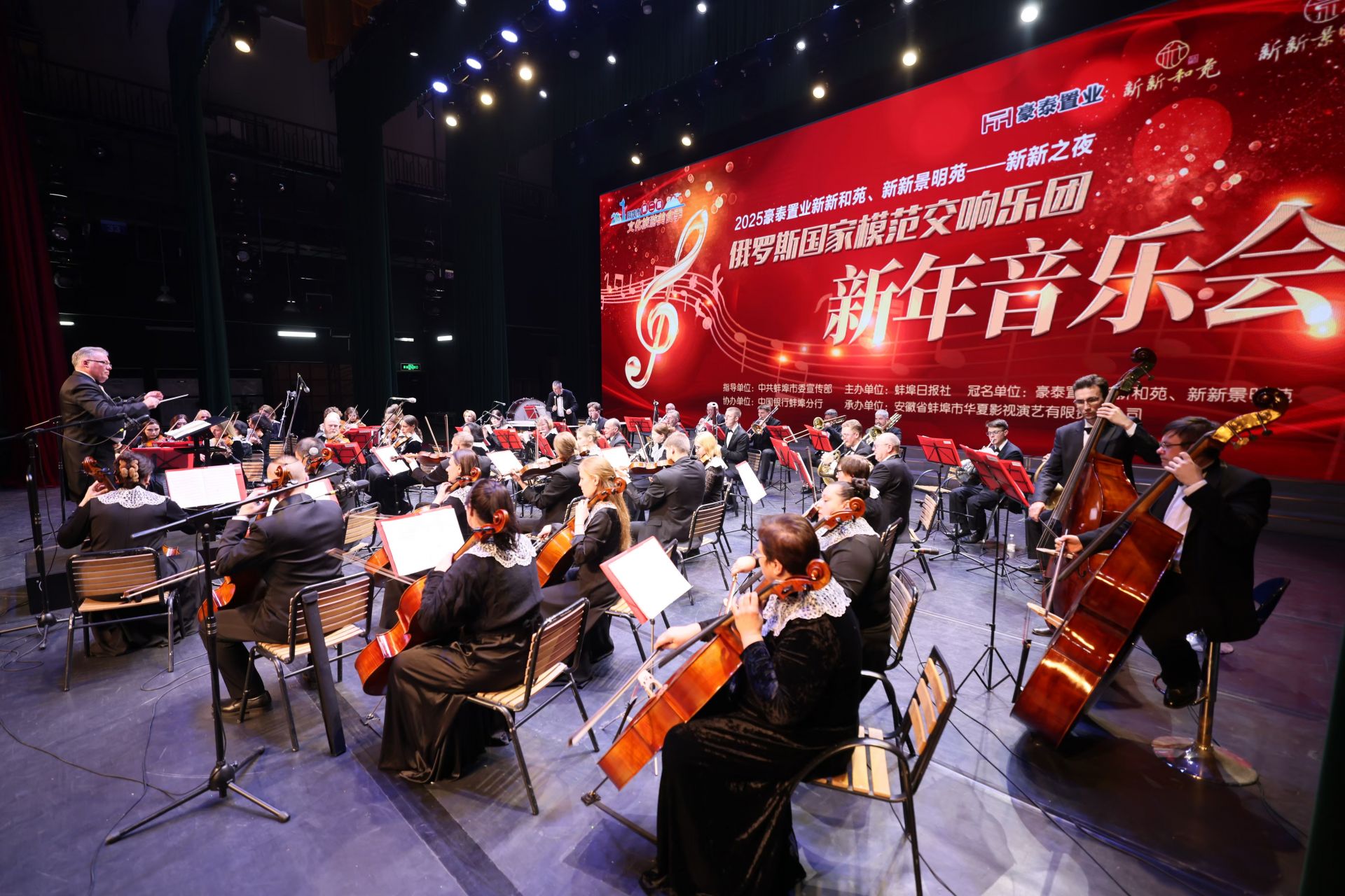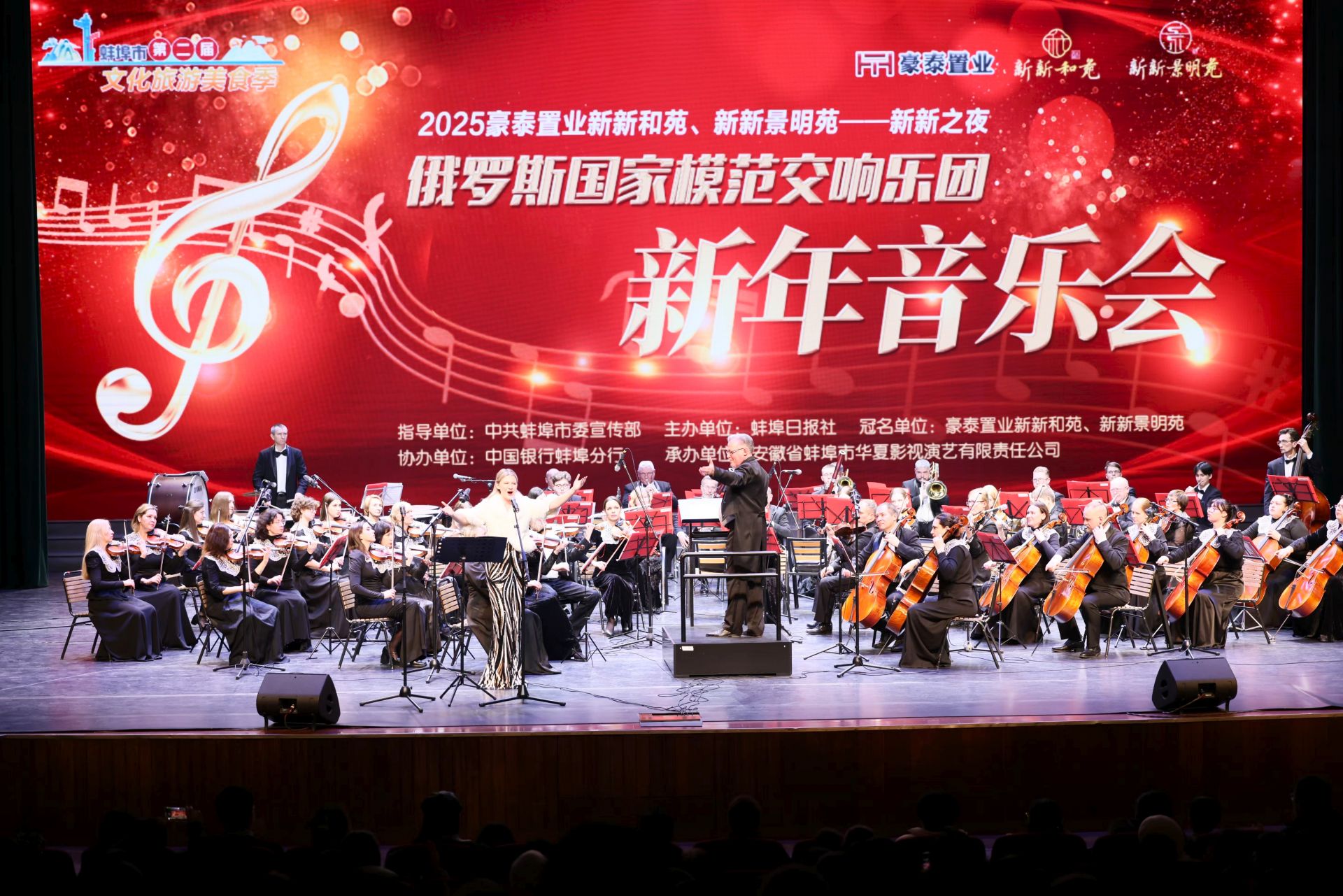 蚌埠发布客户端讯(融媒体记者 何沛 刘晨)随着俄罗斯指挥大师巴尔库·康斯坦丁挥棒,蚌埠大剧院内俄罗斯模范交响乐团应势而起,红色的激流扑面而来,奋进的号角嘹亮吹彻——交响序曲《红旗颂》拉开了整场音乐会的序幕。12月29日晚,作为蚌埠市第二届文化旅游美食季的重要组成部分,由中共蚌埠市委宣传部指导,蚌埠日报社主办,中国银行蚌埠分行协办,豪泰置业旗下新新和苑、新新景明苑冠名的“新新之夜”俄罗斯国家模范交响乐团新年音乐会慨然奏响,世界顶级的俄罗斯国家模范交响乐团为蚌埠市民带来了一场高水准的交响乐盛宴。
