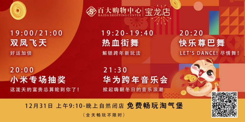(1)双凤飞天(好运加倍);热血街舞(解锁跨年新玩法);(2)快乐尊巴舞(LET'S DANCE!尽情舞)(3)小米专场抽奖(这泼天的富贵总算轮到你了);(4)华为跨年音乐会(掀起嗨翻冬日的音乐浪潮);(5)免费畅玩淘气堡(具体活动内容以店内海报为准)
