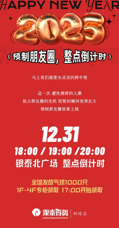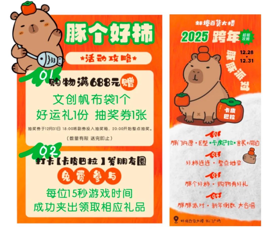 (1)新年有好愿——12月31日晚,在蚌埠百货大楼北门广场新年心愿墙、现场互动整点大抽奖、新年大合唱,亮灯仪式。(2)“豚个好柿”蚌埠首展——现场打卡“卡皮巴拉”巨型气模发朋友圈即可免费参加“筷”乐夹新年礼物活动。(3)福来运转 新年送礼——购物满688元赠“文创定制帆布袋”1个+好运礼品1份+抽奖券1张。(4)停车没烦恼——购物满200元享免费停车:南山停车场、天桥停车场、二马路停车场。