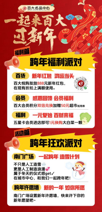 1、福利篇(跨年福利派对)(1)百货新年红包鸿运当头:百大悦购发放888元新年红包,在现有折扣上满额使用;(2)会员感恩回馈会员福利:百大会员积分双倍兑换加赠50元超市抵用券;(3)福利一元复始百财来福:五星卡会员进店即可1元换购大白菜一颗。