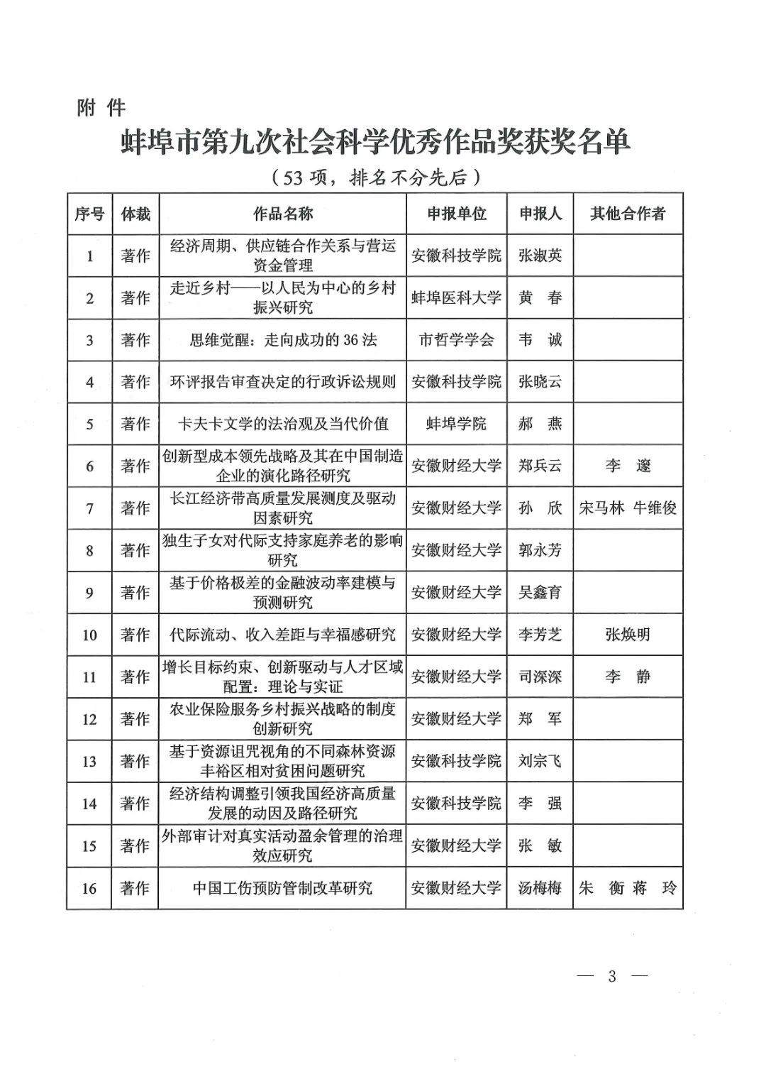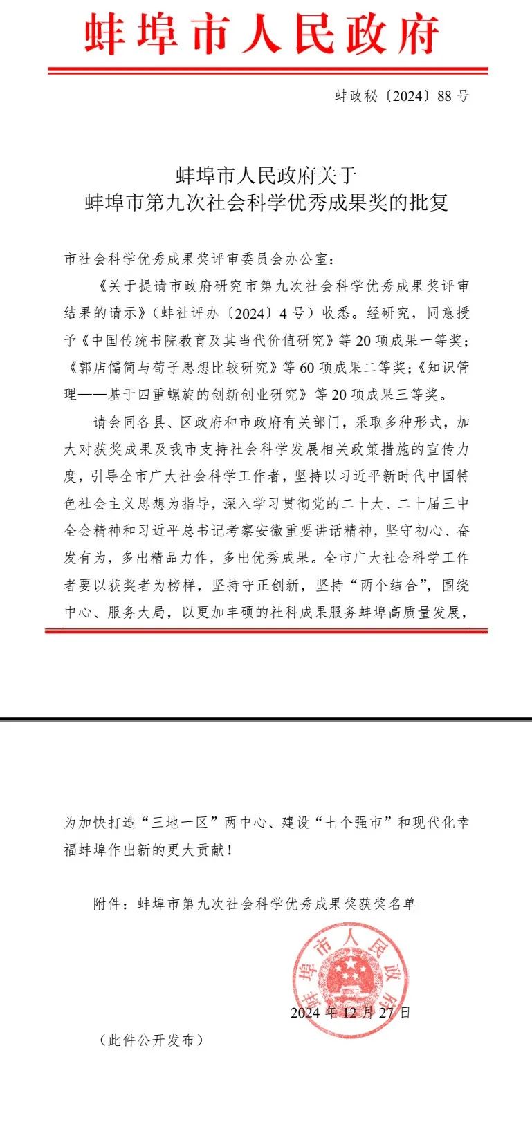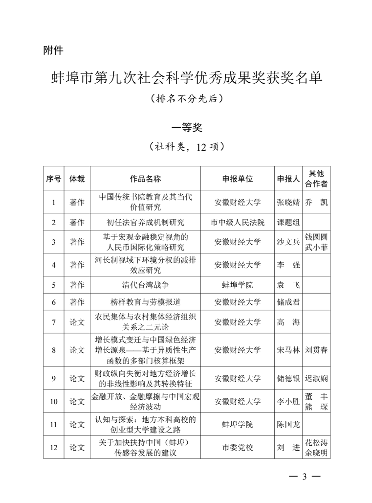 蚌埠发布客户端讯(融媒体记者 何沛)近日,蚌埠市第九次社会科学优秀成果奖揭晓,共评审出优秀成果100项,其中,一等奖20项,二等奖60项,三等奖20项;另53项成果获优秀作品奖,集中展现了蚌埠社会科学研究的优秀理论成果。
