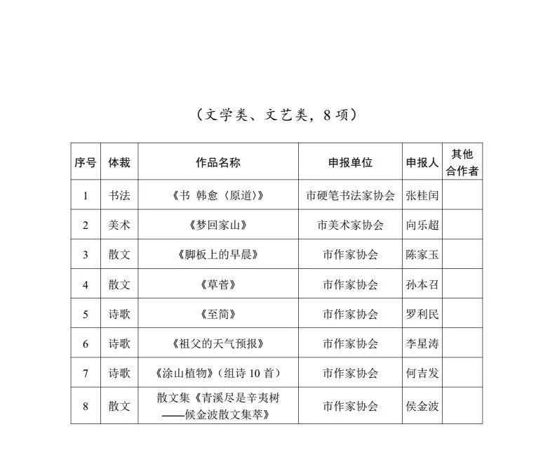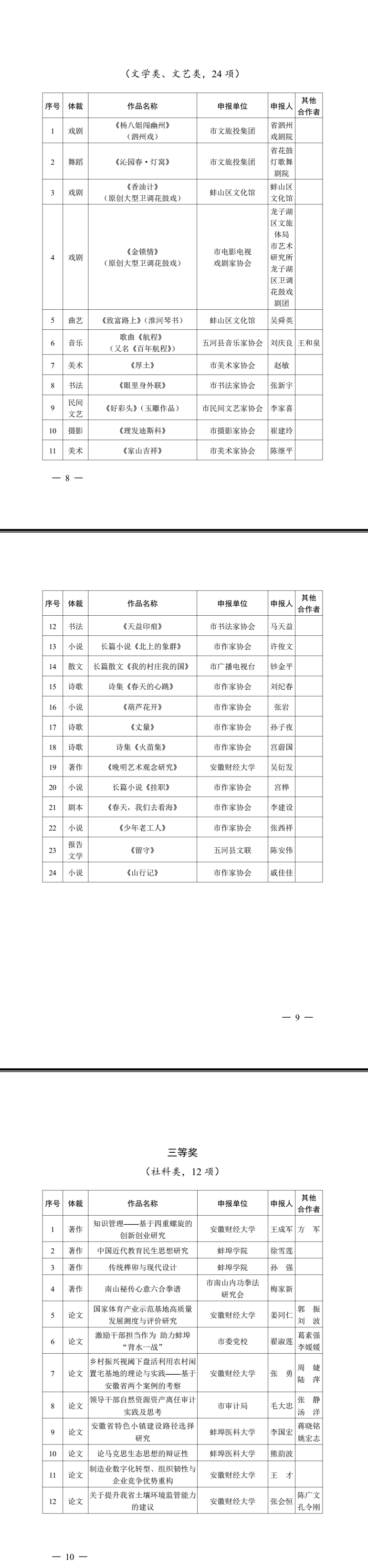 蚌埠市社会科学优秀成果奖,每四年开展一次,被誉为市社科界的“奥运会”。本次评审呈现以下特点:一是首次将文学类、文艺类作品纳入到市社科奖评审范围。同时将一、二等奖比例从40%提高到80%。同步推进,同时上会,是一次全新的尝试,取得了良好的效果;二是申报成果覆盖面广、门类多样。涵盖驻蚌高校、党政机关、企事业单位、社会组织、文艺院团等均有成果。门类齐全,社科类成果包括著作、论文、研究报告等;艺术类、文学类涉及9个文化艺术门类,包括微电影、微短剧、网络影视作品新兴的文艺作品;三是申报成果质量高。社科类成果有国家顶级期刊封面文章、有国家课题成果、有得到中央领导、省委省政府主要领导批示;文学文艺类成果有获得国家级、省部级奖励;四是创新评审工作方式。坚持把作品质量放在第一位,建立层层筛选机制,从单位申报公示初审、专家初评、学科组复评,至提交评审委会终评。评审本着以质论奖、好中选优、宁缺毋滥的原则,首次采用“市外权威专家+本地公认专家”结合方式,组成7个学科专家评审组,并由市外权威专家担任各学科复评组组长,实施全流程监督、全过程监控,确保审过程和结果经得起时间检验,经得起群众监督。