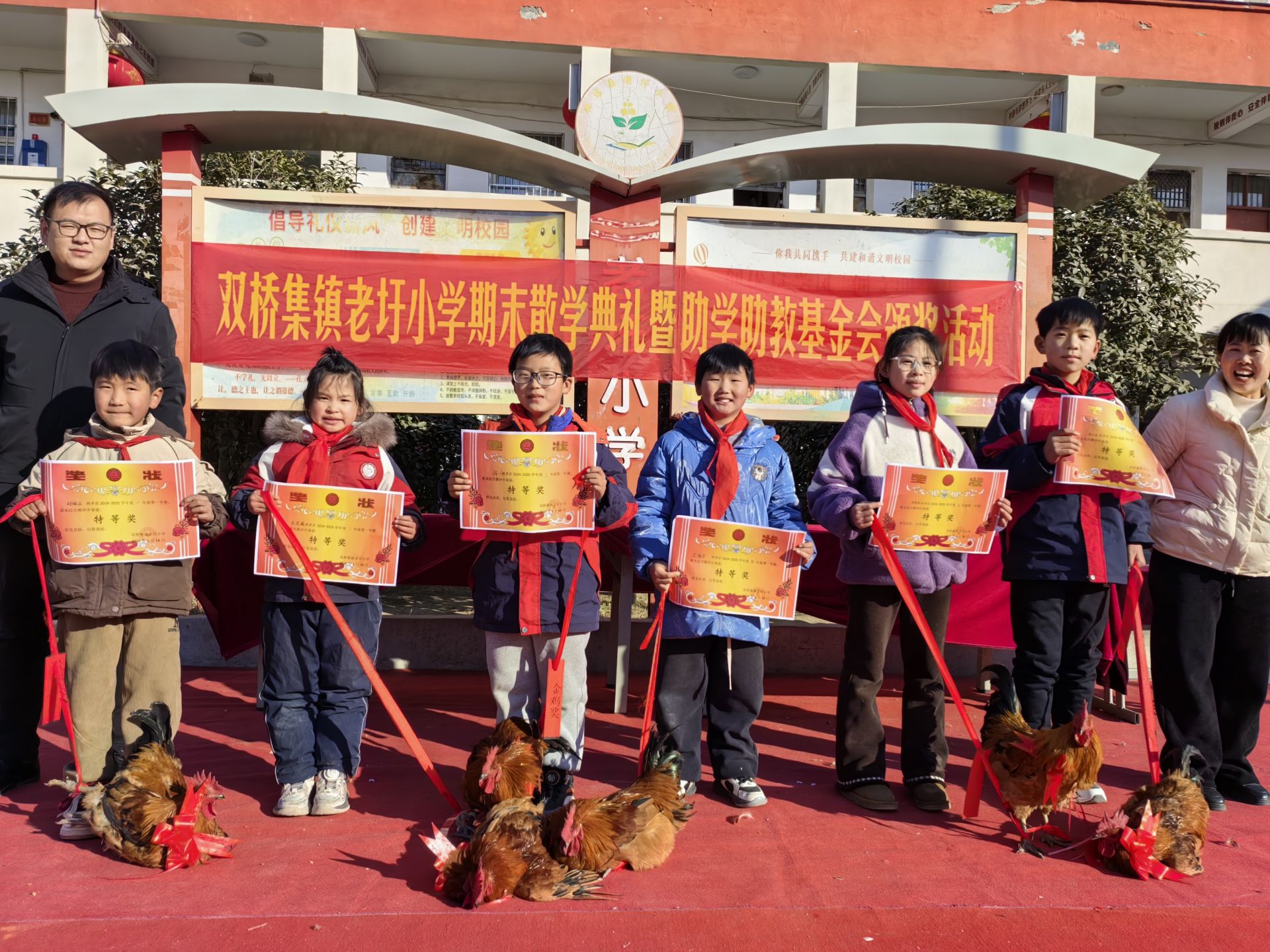 蚌埠发布客户端讯(融媒体记者 谢勋章 实习生 赵子涵 文/图)左手一张奖状 ,右手一只蹄膀!1月16日,一场别开生面的期末表彰大会,在怀远县双桥集镇老圩小学成功举办,小孩在获得奖励的同时,也营造出了浓厚的年味。
