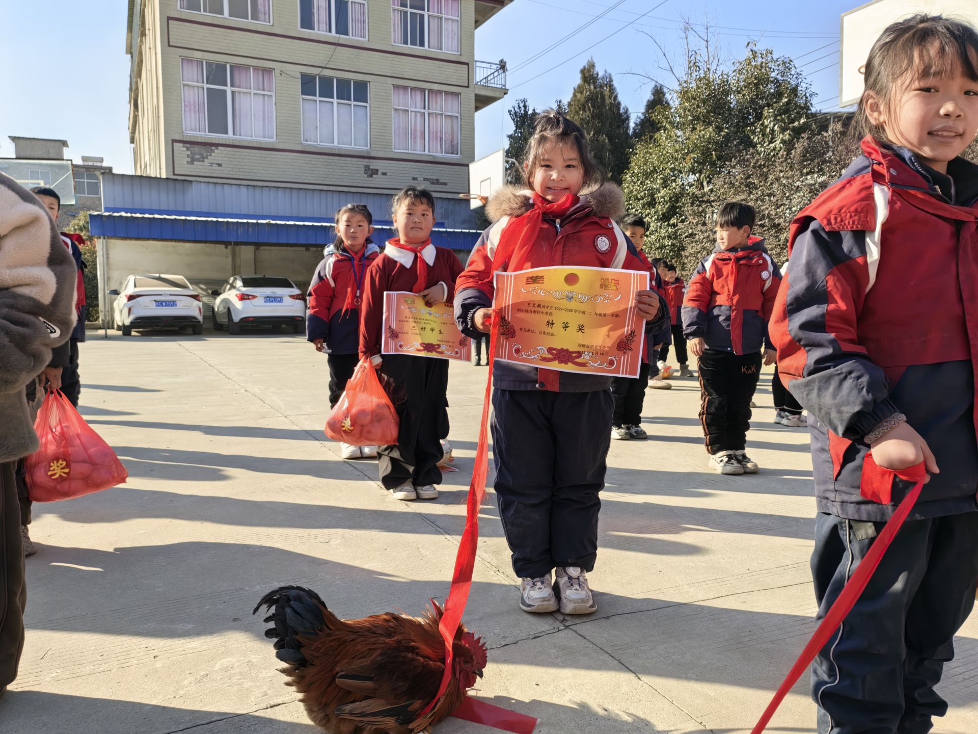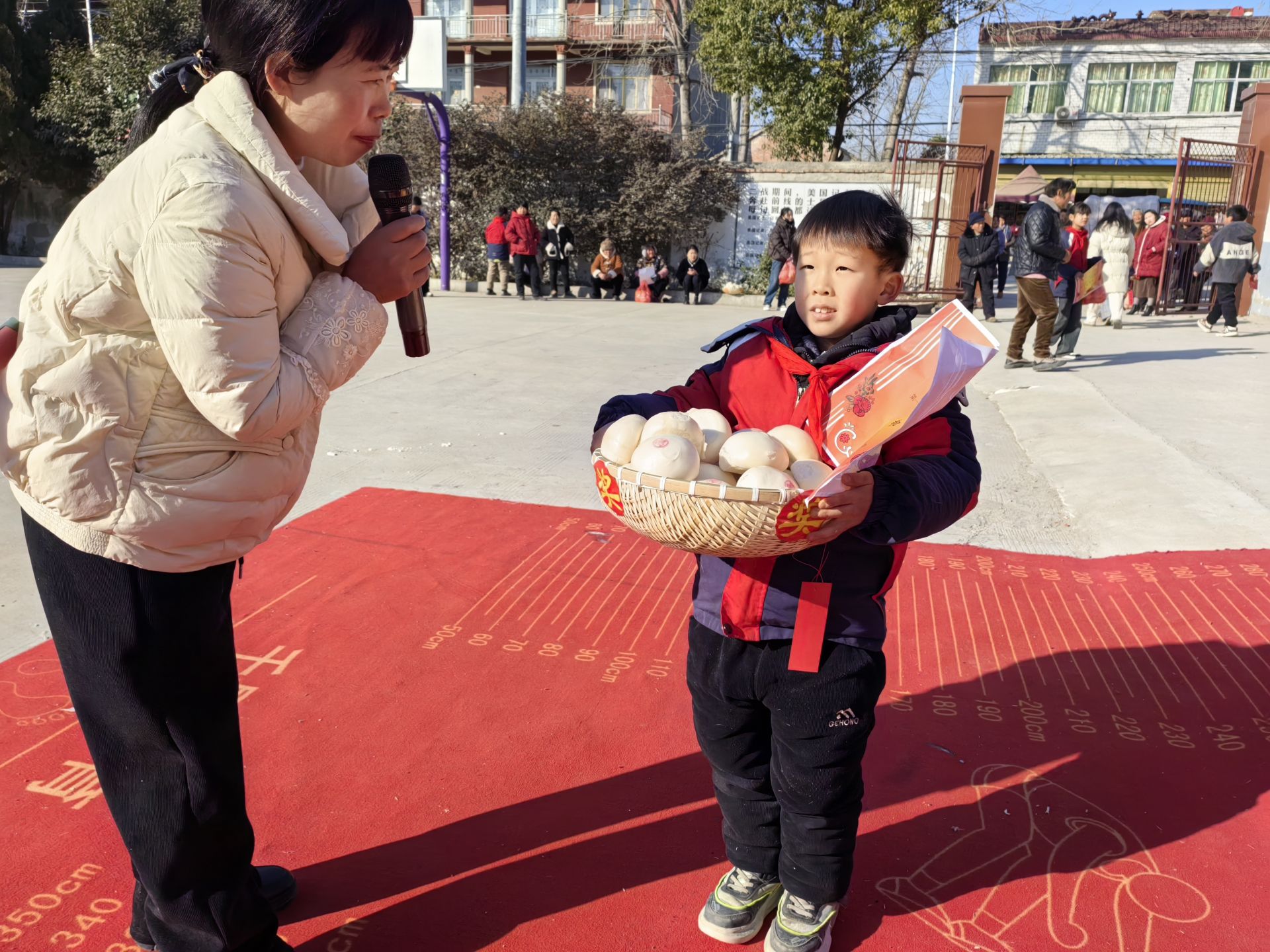 “这种奖品看得见摸得着,一人得奖,全家都高兴。”老圩小学教导主任田艳飞说,此举意在激励学生的学习热情,让他们明白努力与收获成正比的道理。拿到奖励后,学生们漏出了灿烂的笑容,浓厚的年味在校园里弥漫。