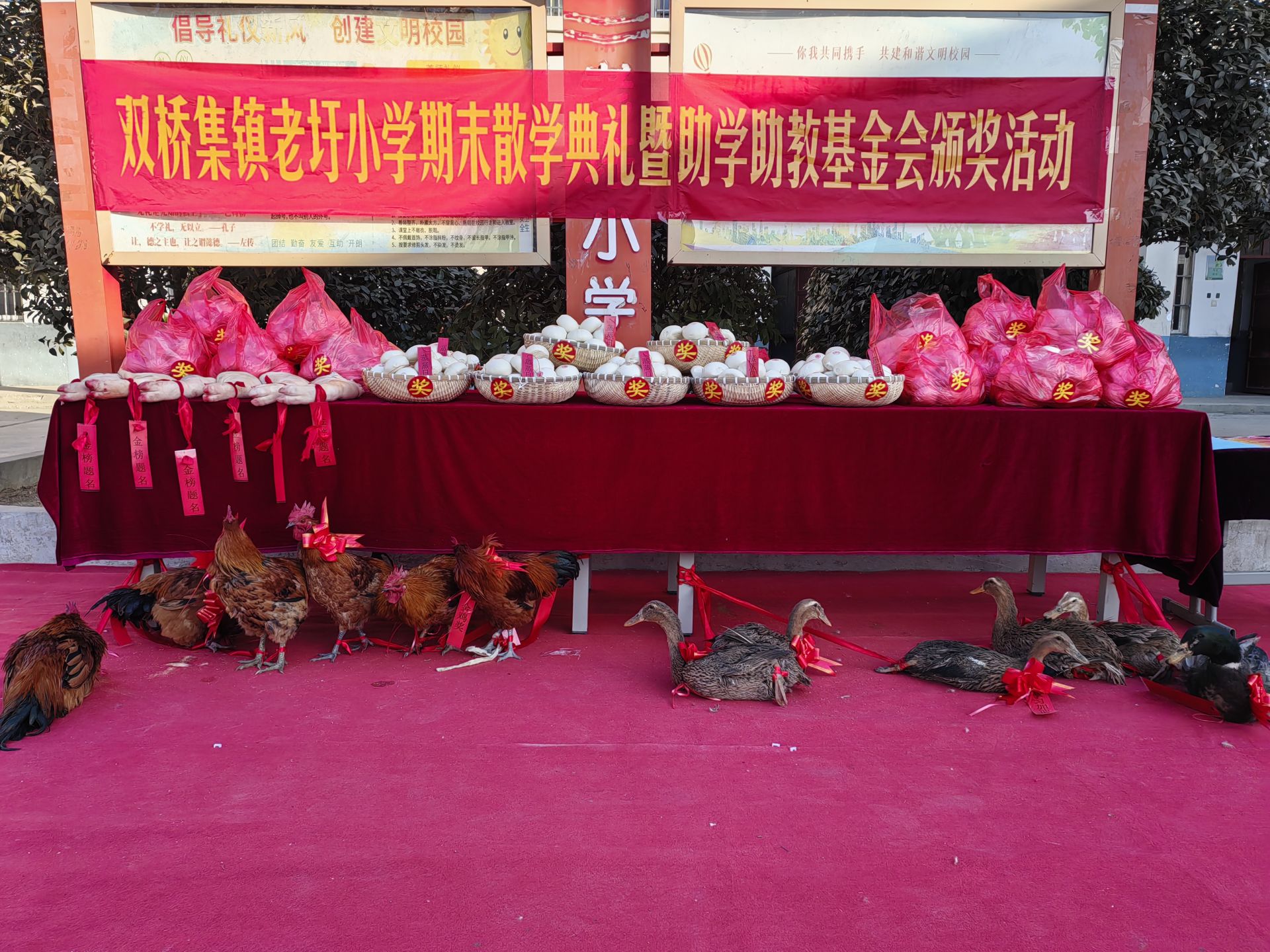 奖励办法方面,学校坚持精神鼓励为主、物质奖励为辅的原则。全科年级第一名的特等奖学生将获得“金鸡奖”--—只公鸡,一等奖获得“加油鸭”--—只鸭子,二等奖获得“金榜题名”——一个猪蹄膀,优秀班干部和三好学生则获得20个馒头,寓意“蒸蒸日上”。此外,学校还为获奖学生颁发了奖状证书,并在宣传栏上专版公榜获奖学生名单,宣传他们的学习事迹。