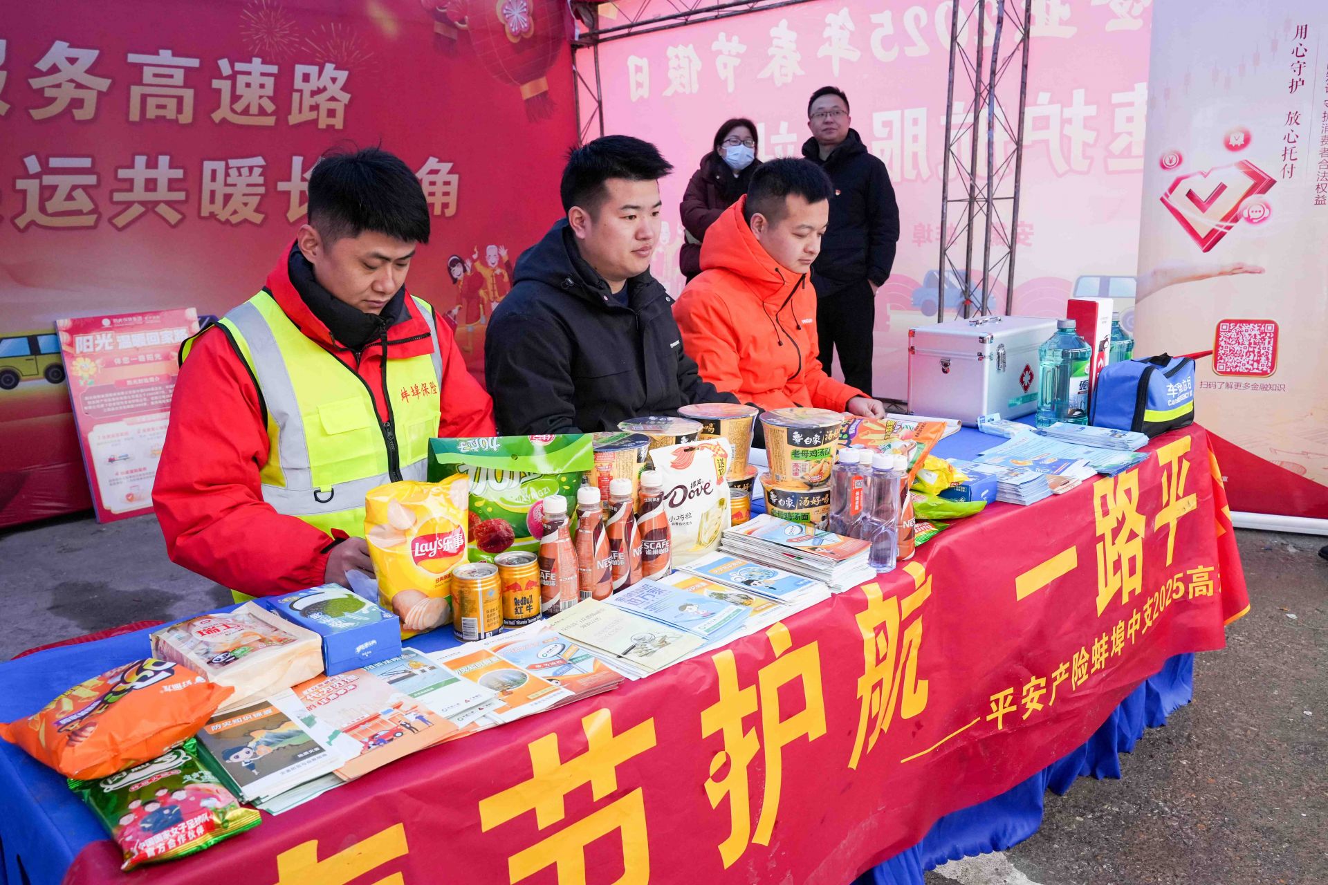 方便面、纯净水、行车安全指南……在高速护航服务站设置了展台,向社会公众进行保险反欺诈、打击“保险黑产”、保险金融知识等方面宣传,并提供保险咨询。此外,工作人员还为车主提供了饮用水、应急油料、应急电源启动,应急救援、轮胎充气、应急食品、基础防疫物质、急救医药包等服务。