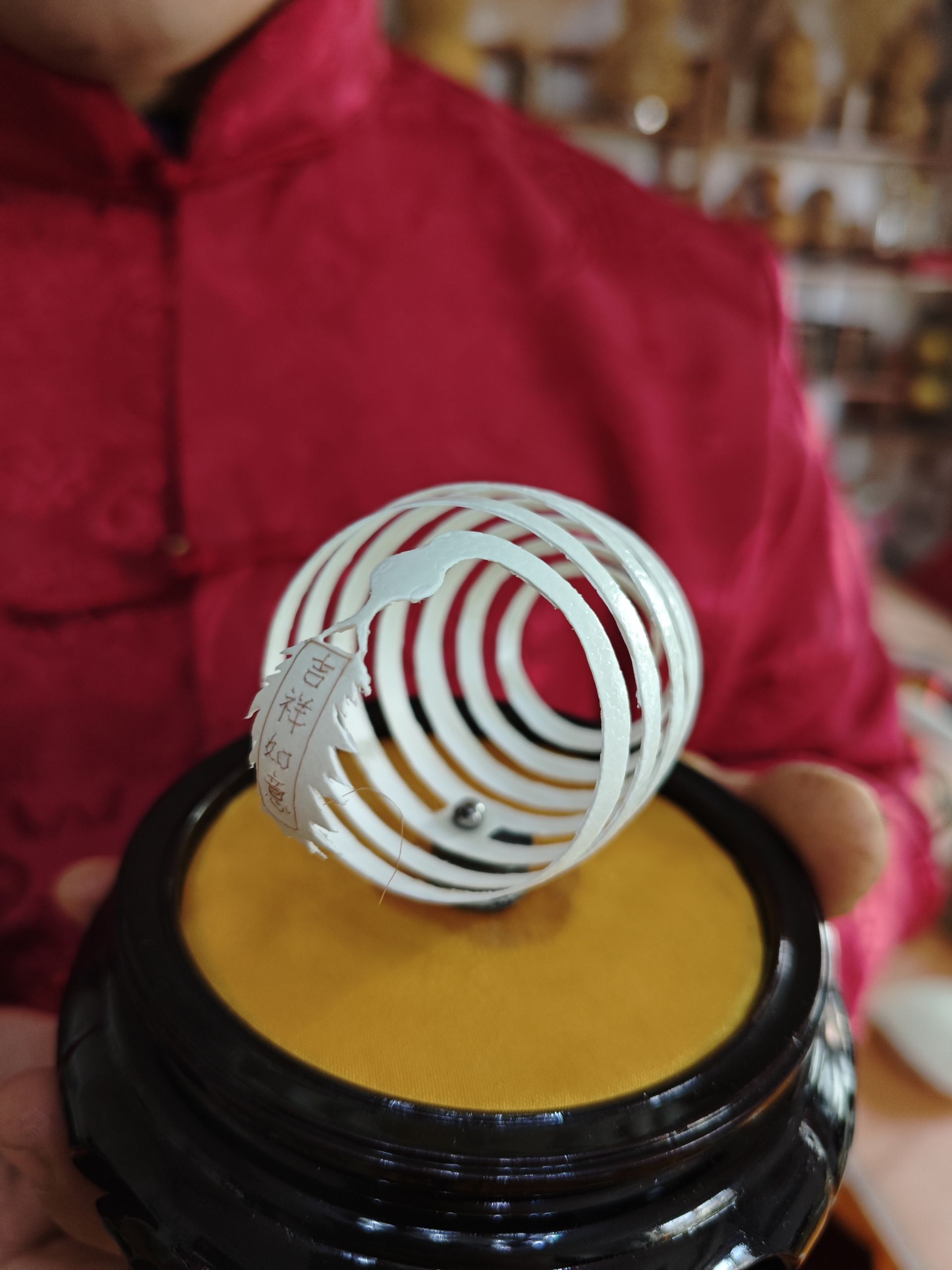 值得一提的是,作品还大胆借鉴“刺绣”技法,在蛇信子前端雕出条幅,再用细铜线“刺绣”出“吉祥如意”四字祝福语,将传统蛋雕与刺绣技艺巧妙融合,别具匠心。